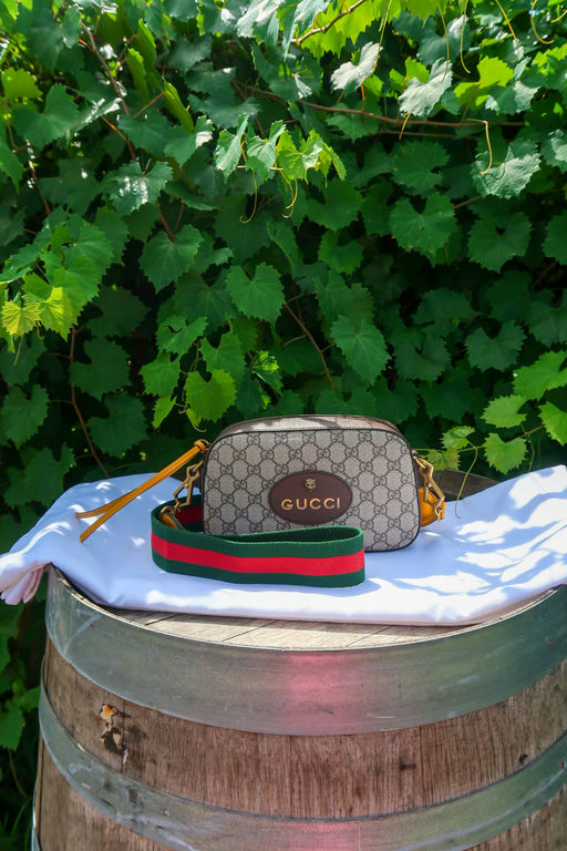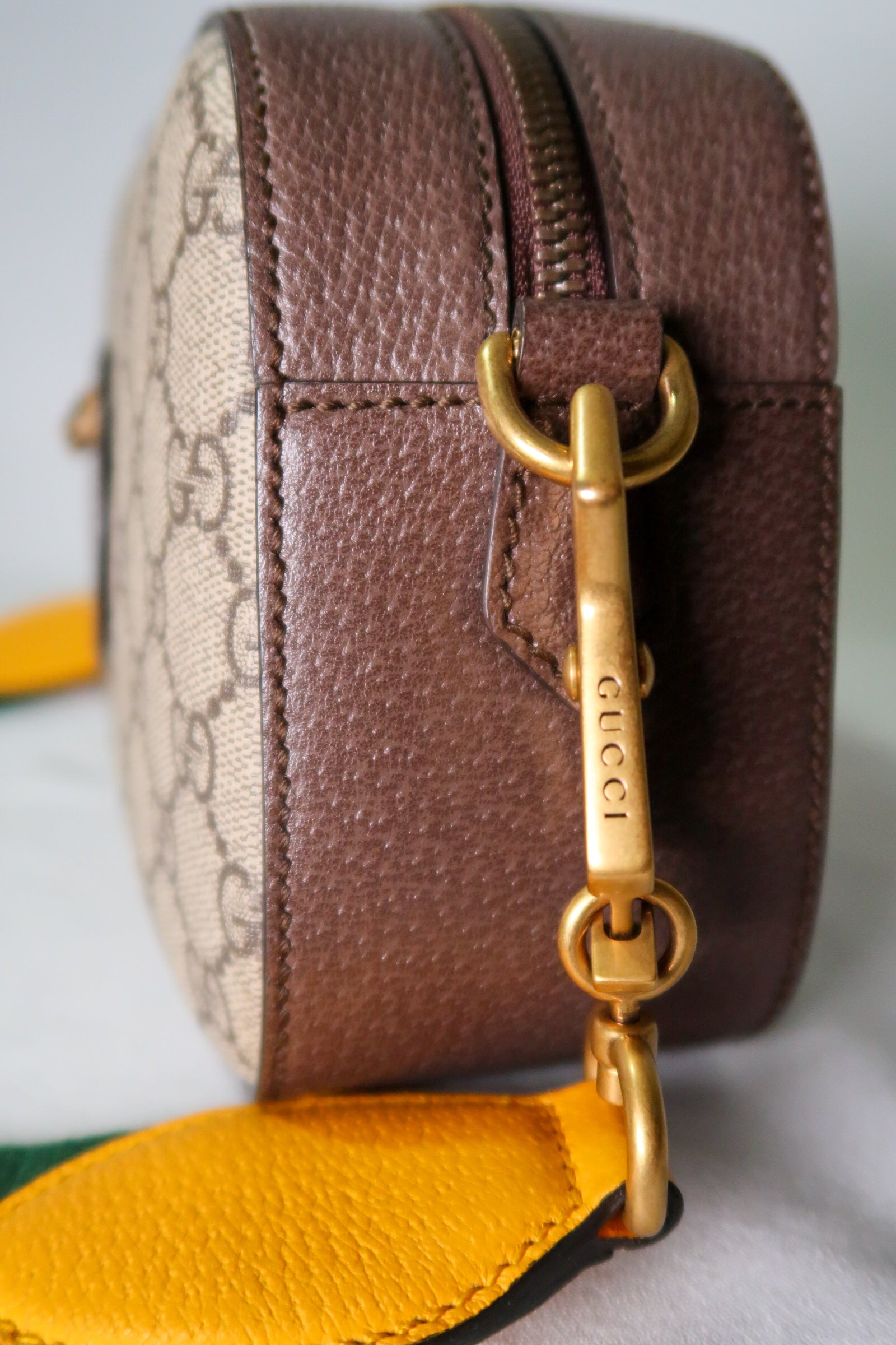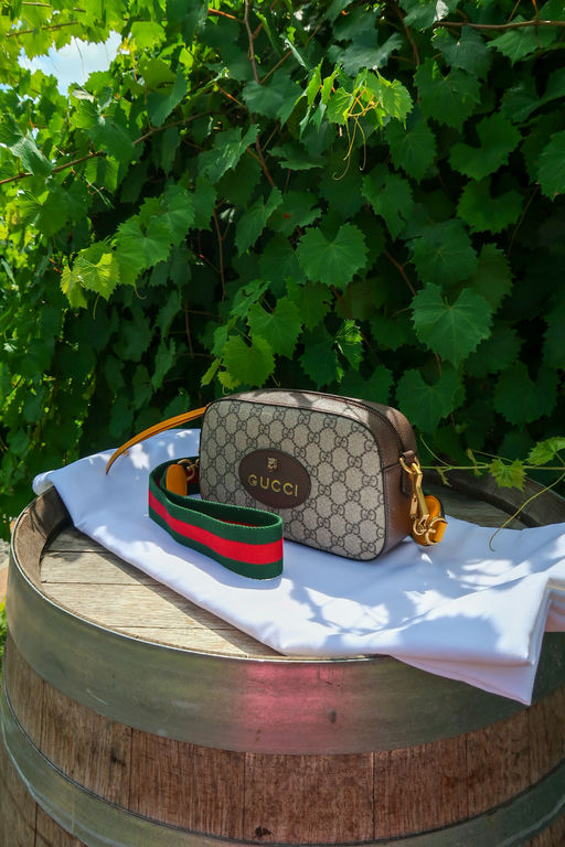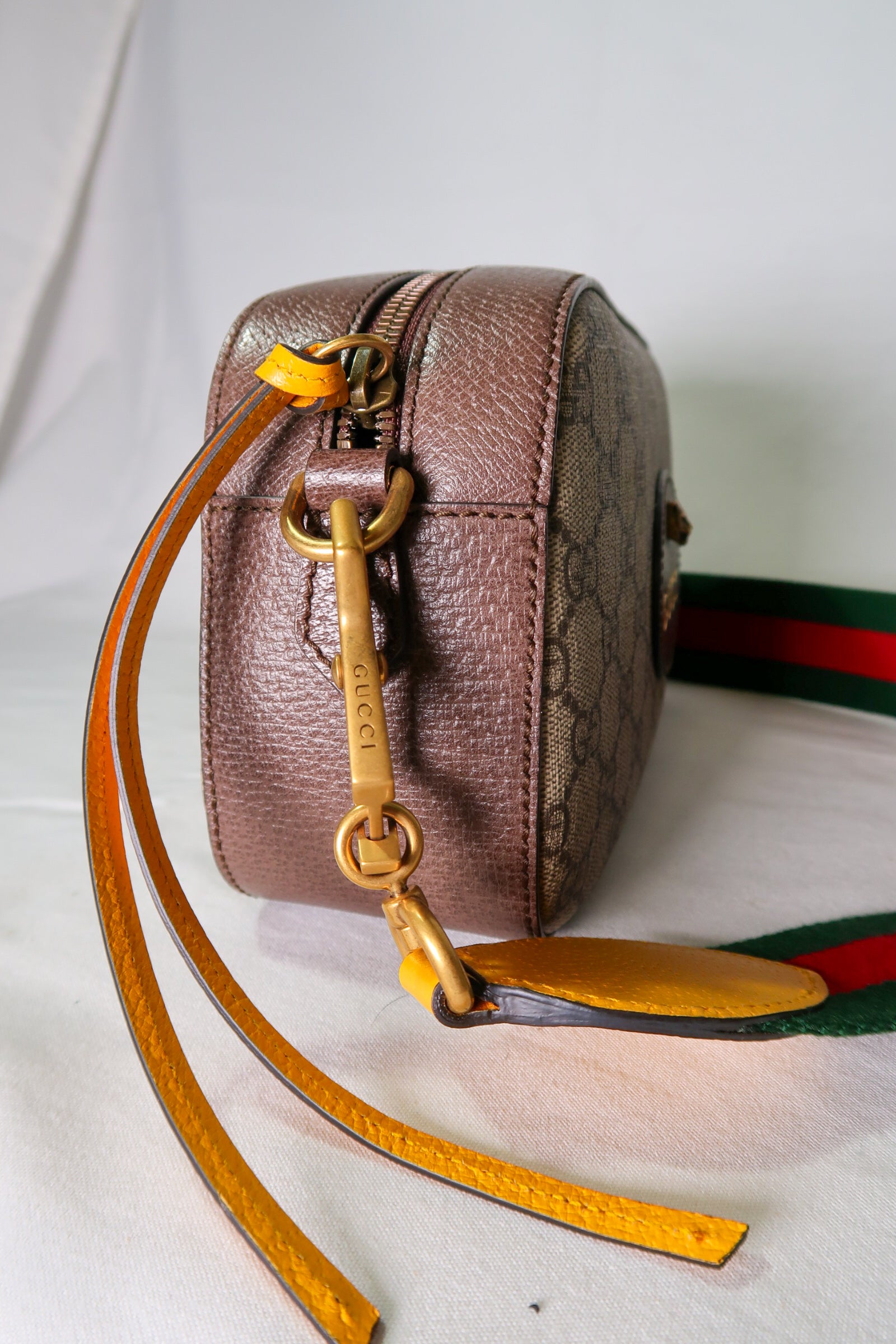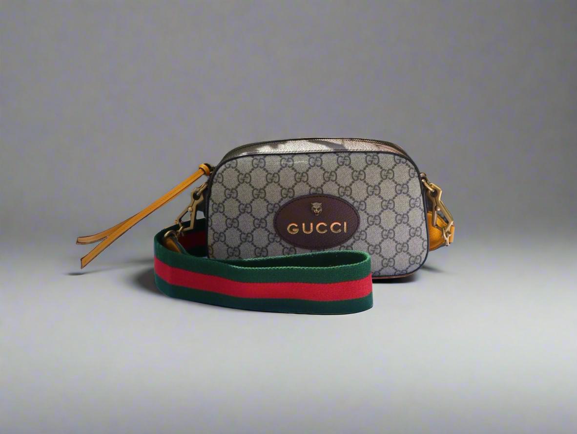Beige/ebony GG Supreme coated canvas. Smooth brown leather trim Detachable green and red Web shoulder strap with leather ends Zip-around top closure . Front Gucci leather patch with gold bee detail. Gold-tone hardware throughout