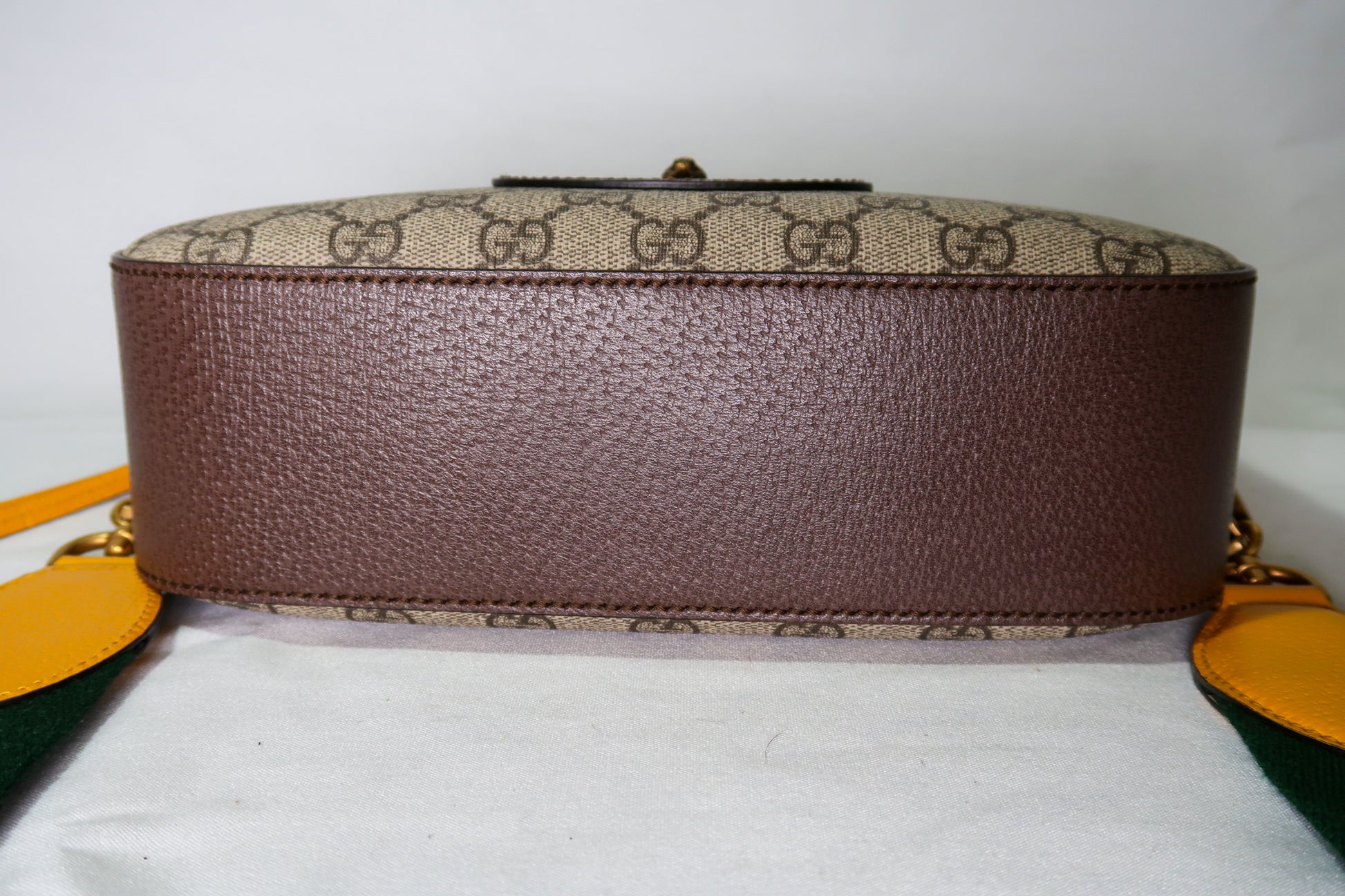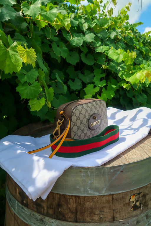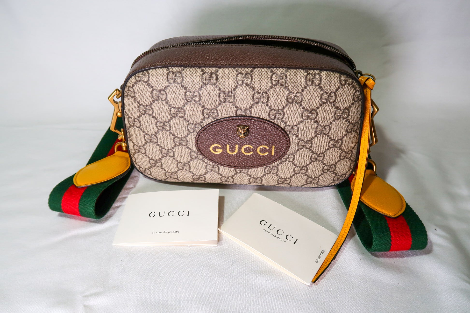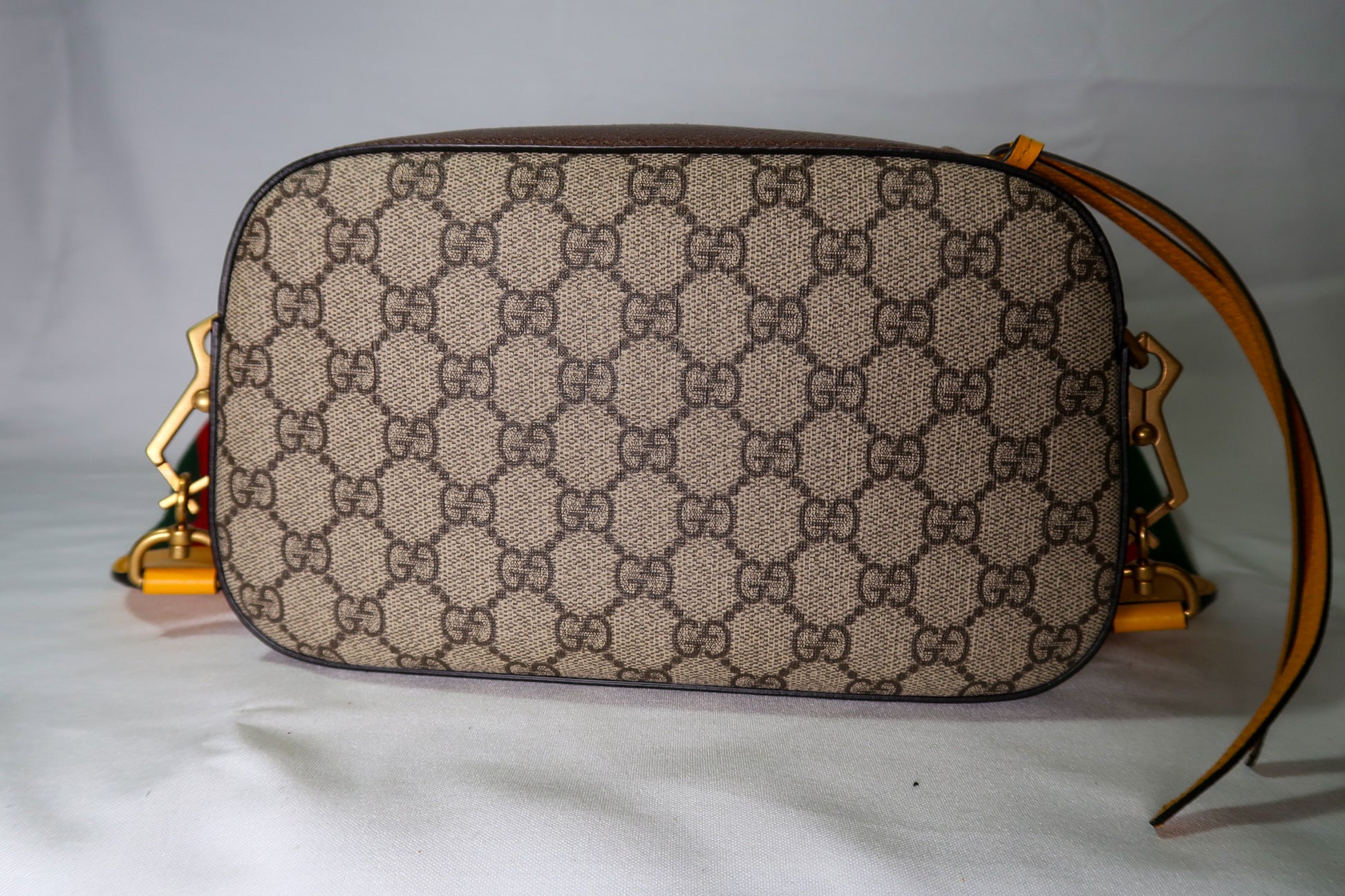 Beige/ebony GG Supreme coated canvas. Smooth brown leather trim Detachable green and red Web shoulder strap with leather ends Zip-around top closure . Front Gucci leather patch with gold bee detail. Gold-tone hardware throughout