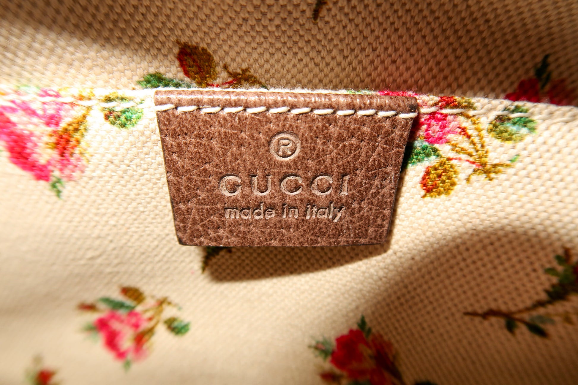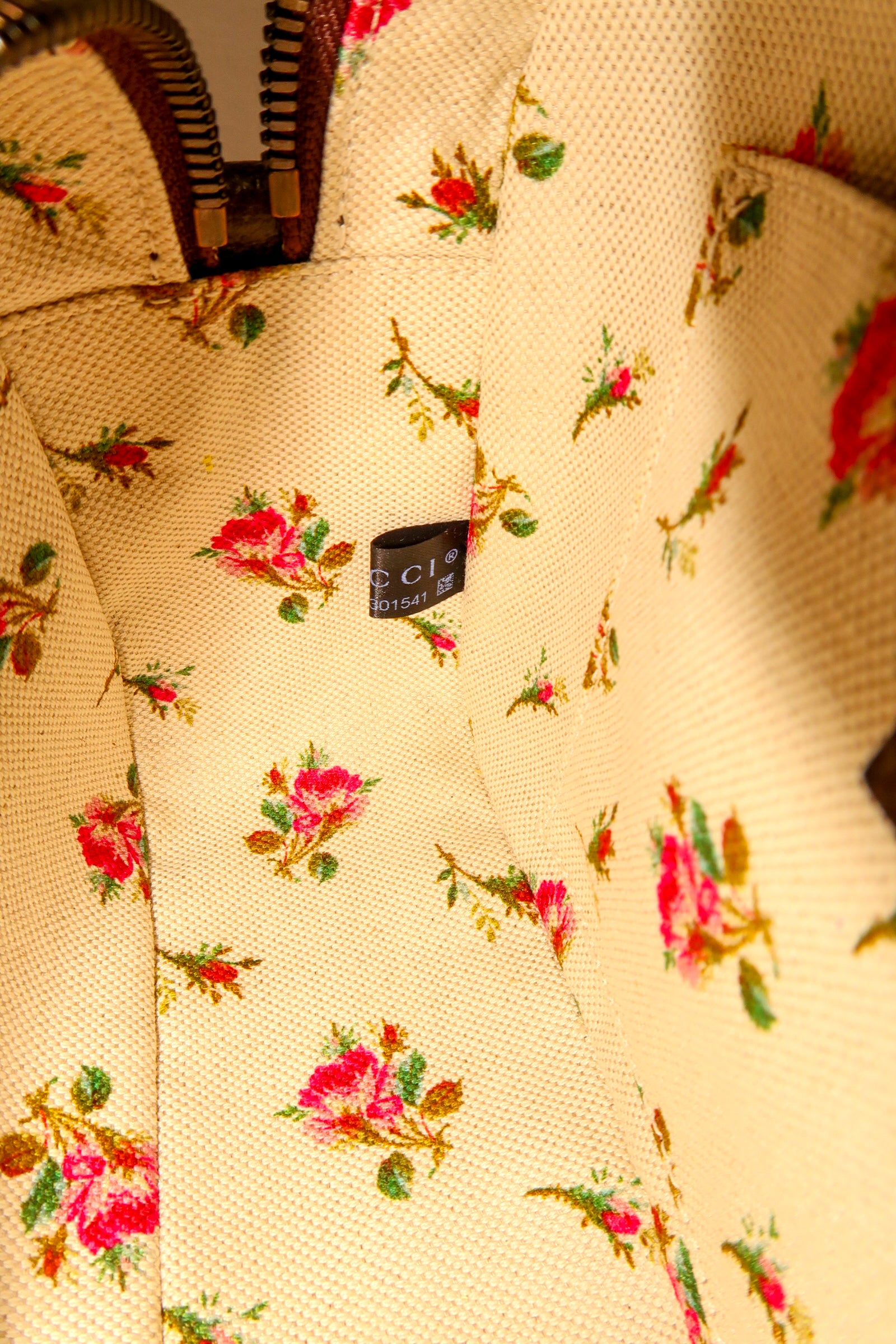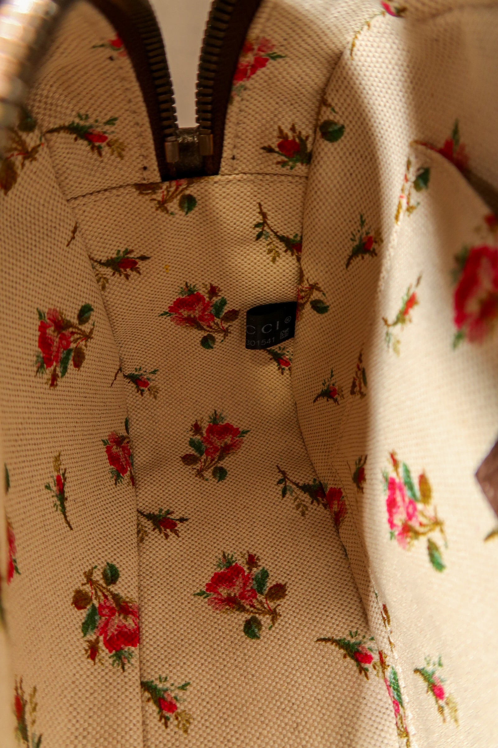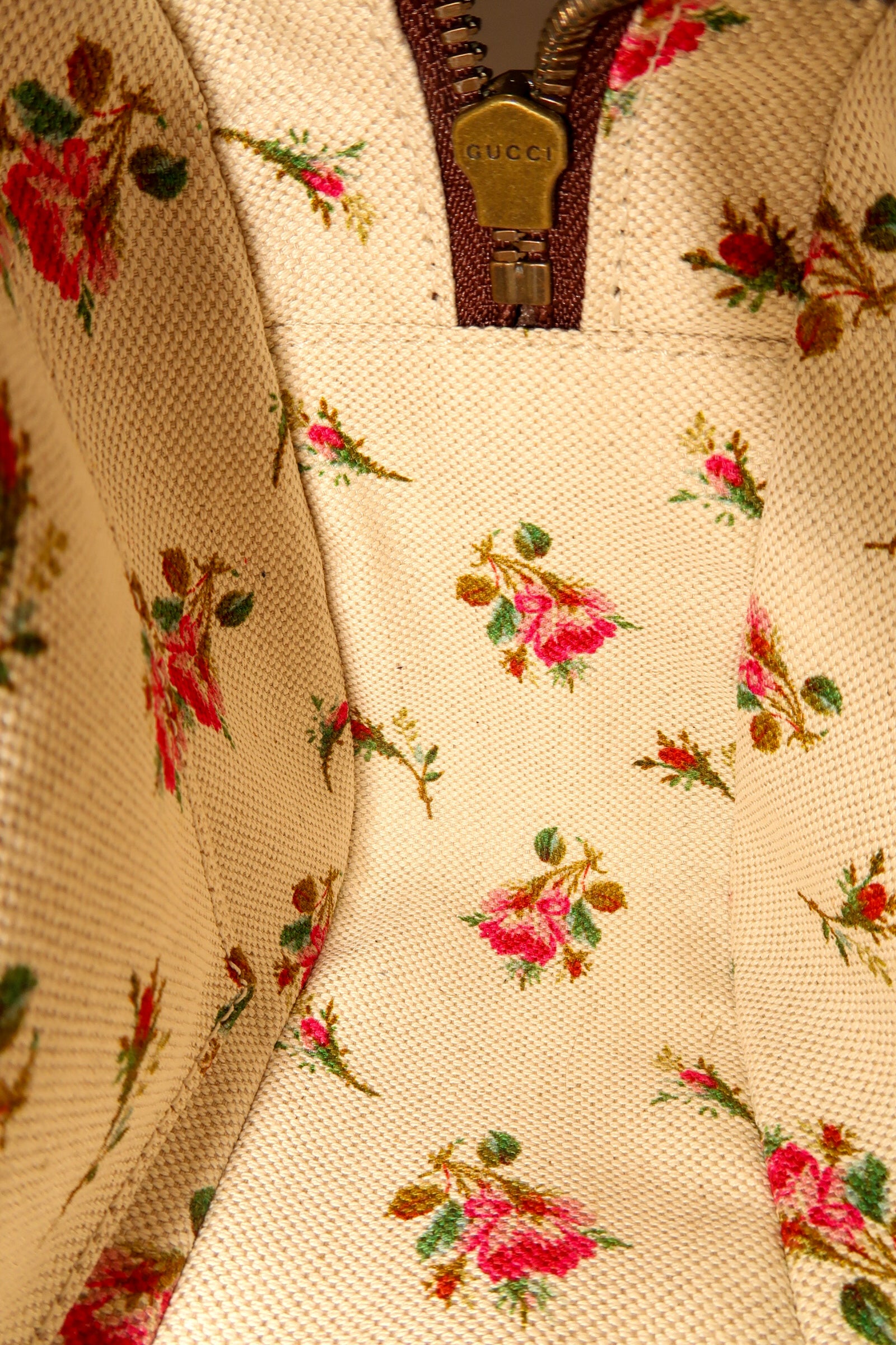 Beige/ebony GG Supreme coated canvas. Smooth brown leather trim Detachable green and red Web shoulder strap with leather ends Zip-around top closure . Front Gucci leather patch with gold bee detail. Gold-tone hardware throughout