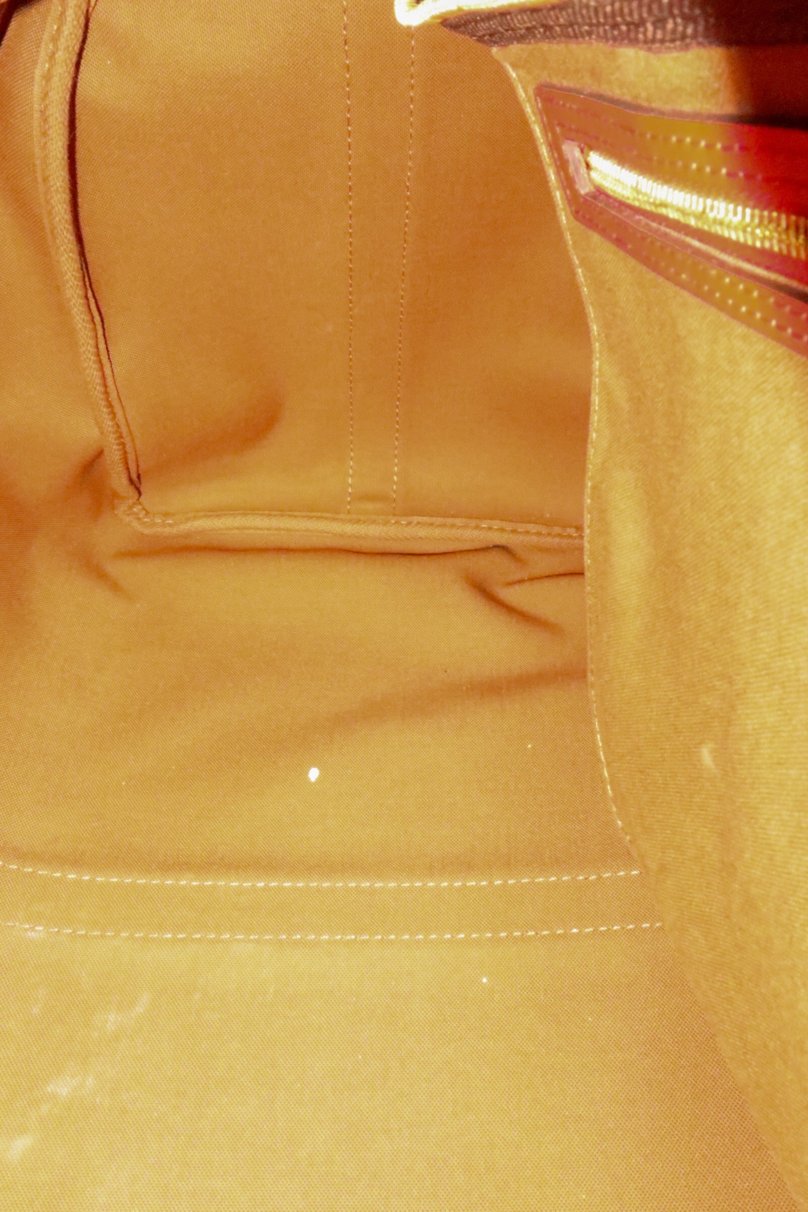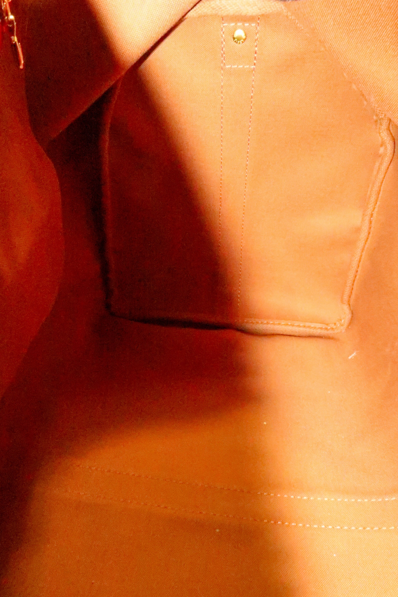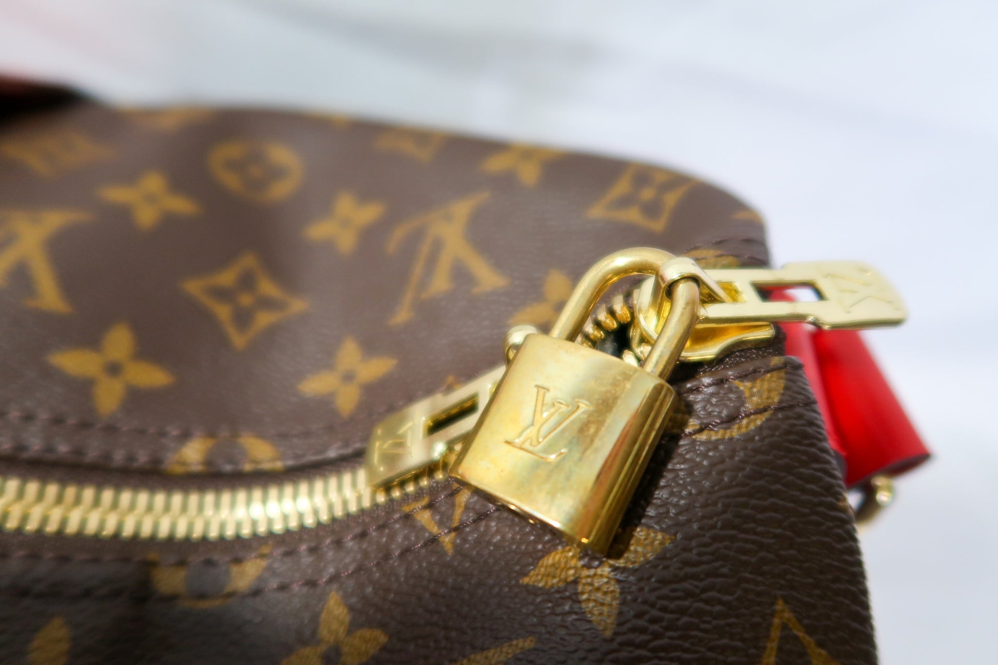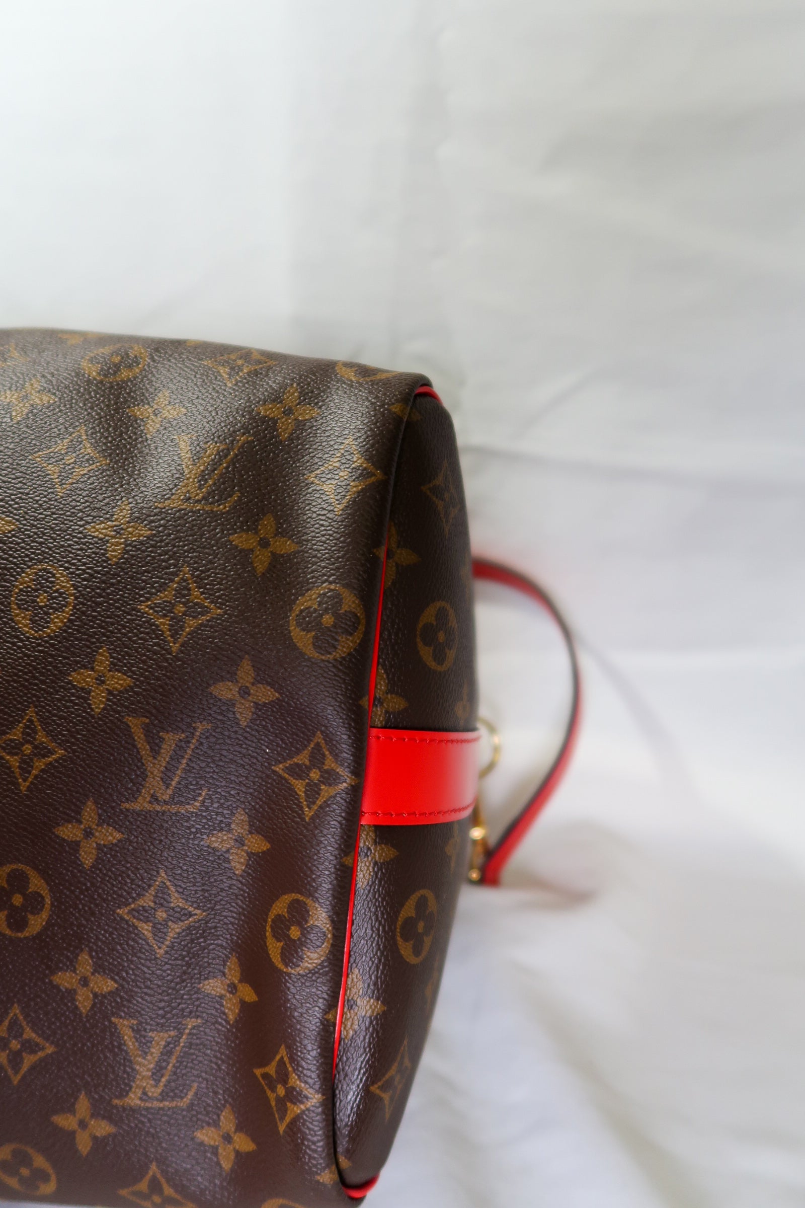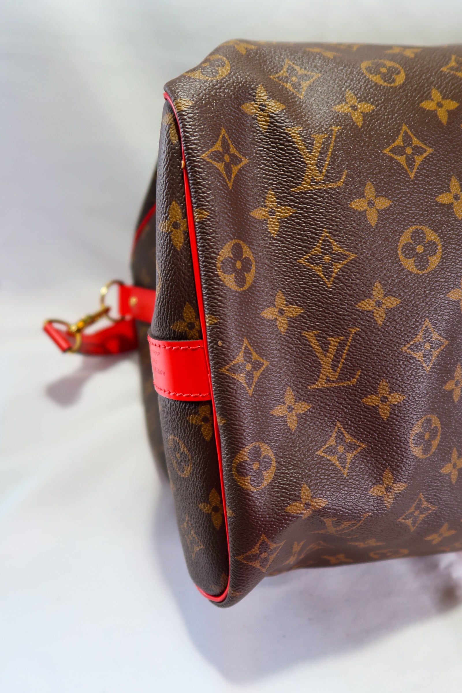 The vibrant red cowhide leather trim contrasts beautifully against the brown monogram canvas, featuring matching handles, a removable shoulder strap, leather name tag, and gold-tone hardware. Ideal for short getaways or a polished carry-on look.