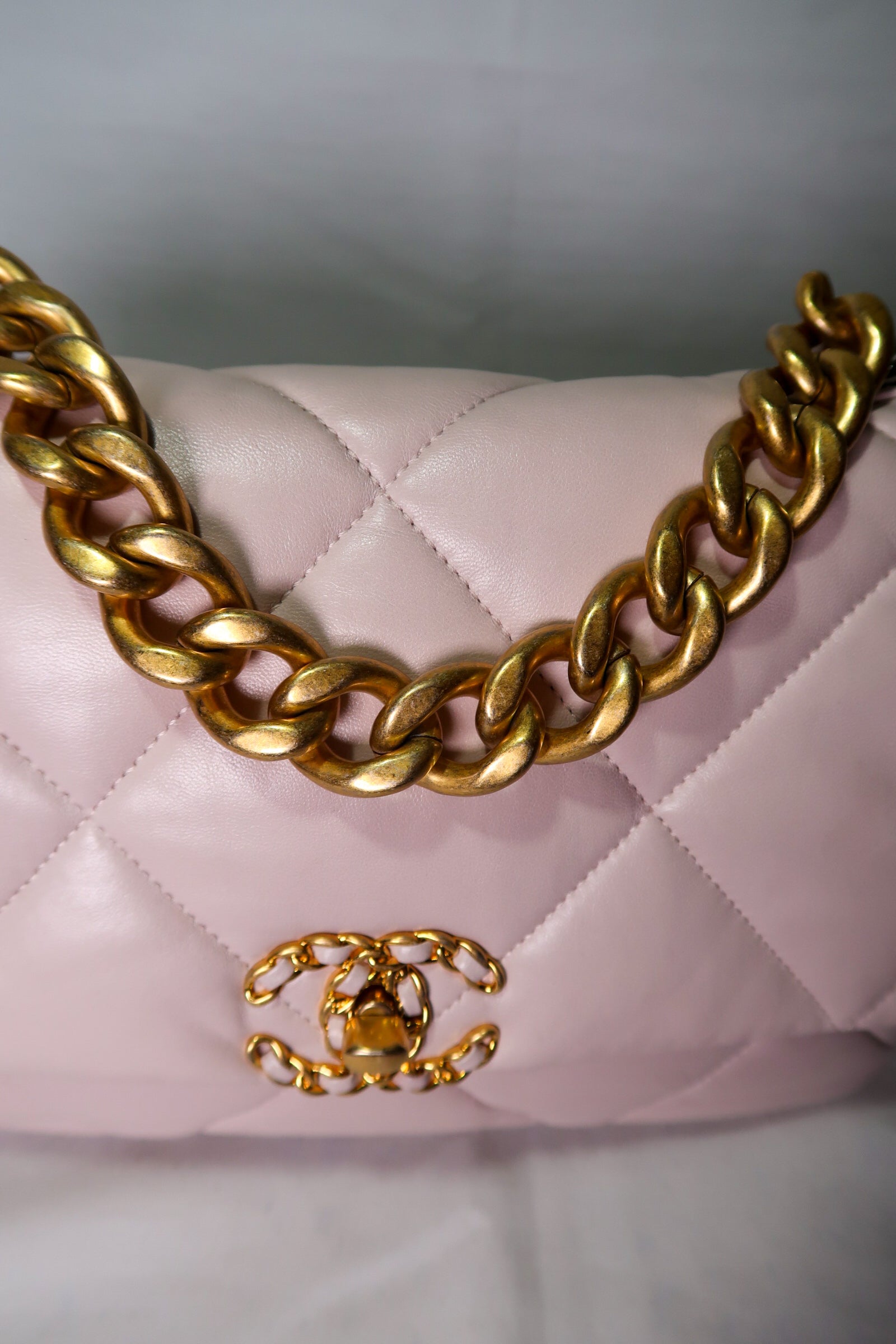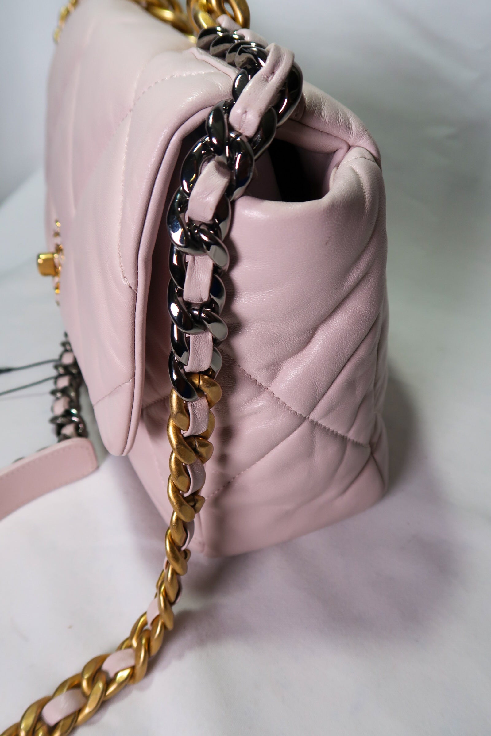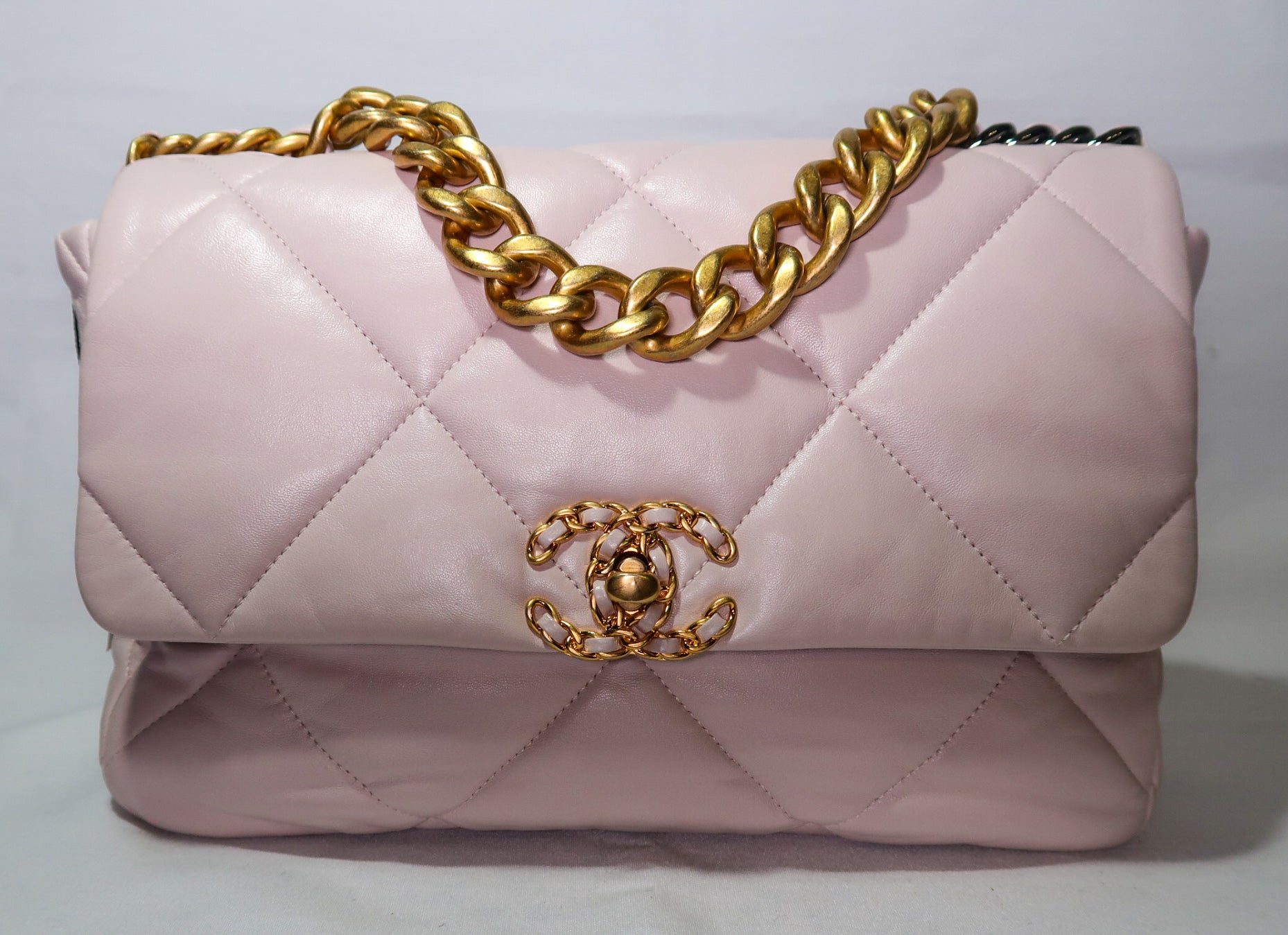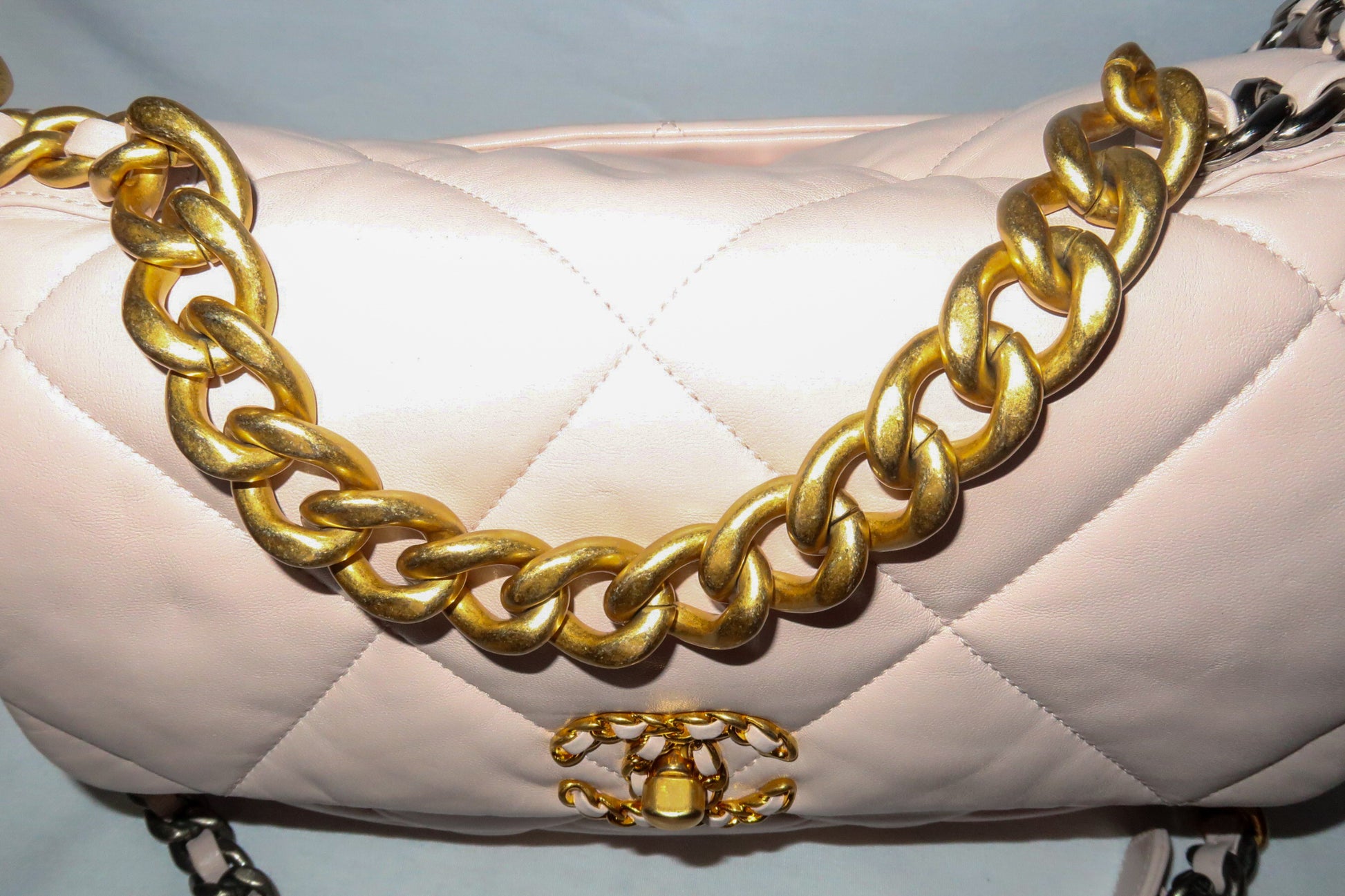 This Chanel 19 Medium Flap Bag is a modern reinterpretation of the classic flap, crafted in buttery soft light pink lambskin leather with signature oversized diamond quilting. It features the iconic double CC logo on the front, woven with mixed metal chain detailing. The bag includes a chunky gold-tone chain top handle, along with a leather-threaded shoulder strap in mixed gold, silver, and ruthenium-tone hardware — a hallmark of the Chanel 19 line. Elegant and fashion-forward, this versatile piece can be worn by hand, on the shoulder, or crossbody.