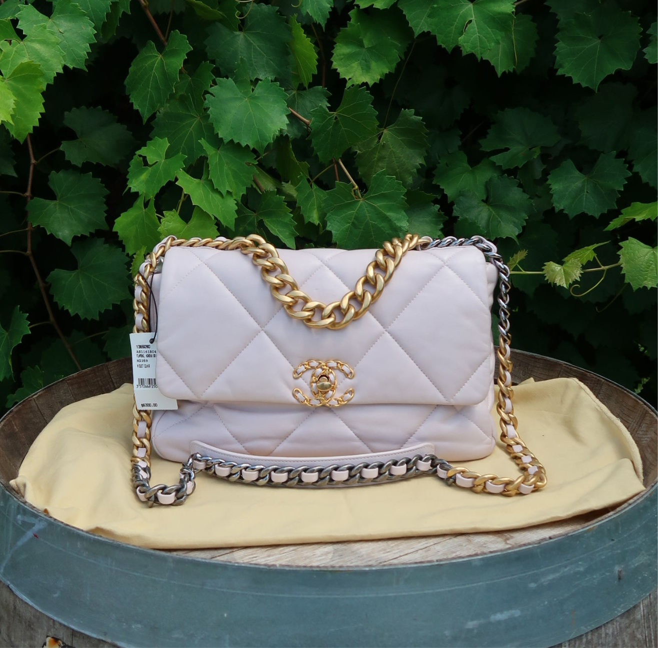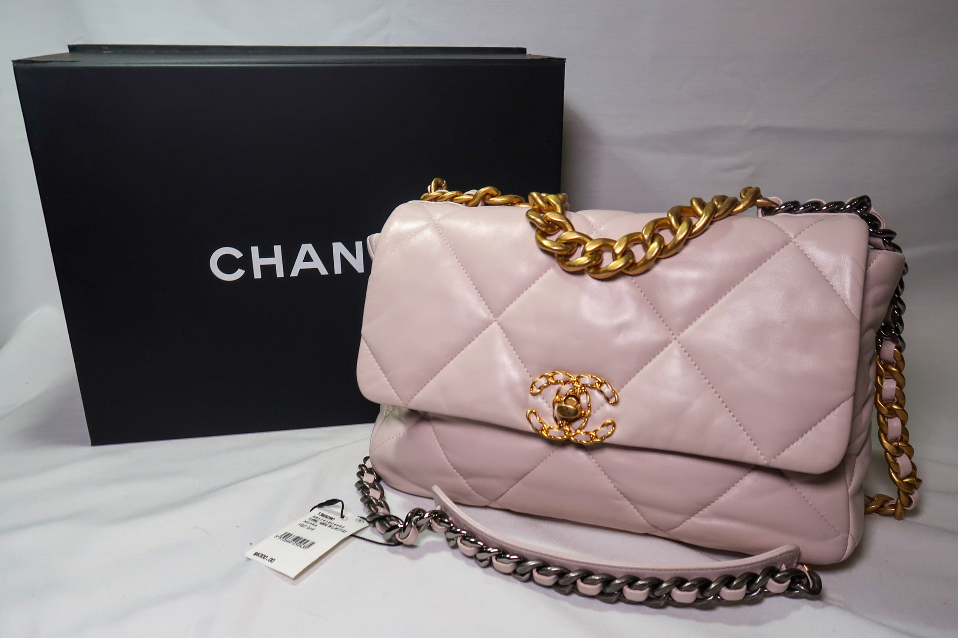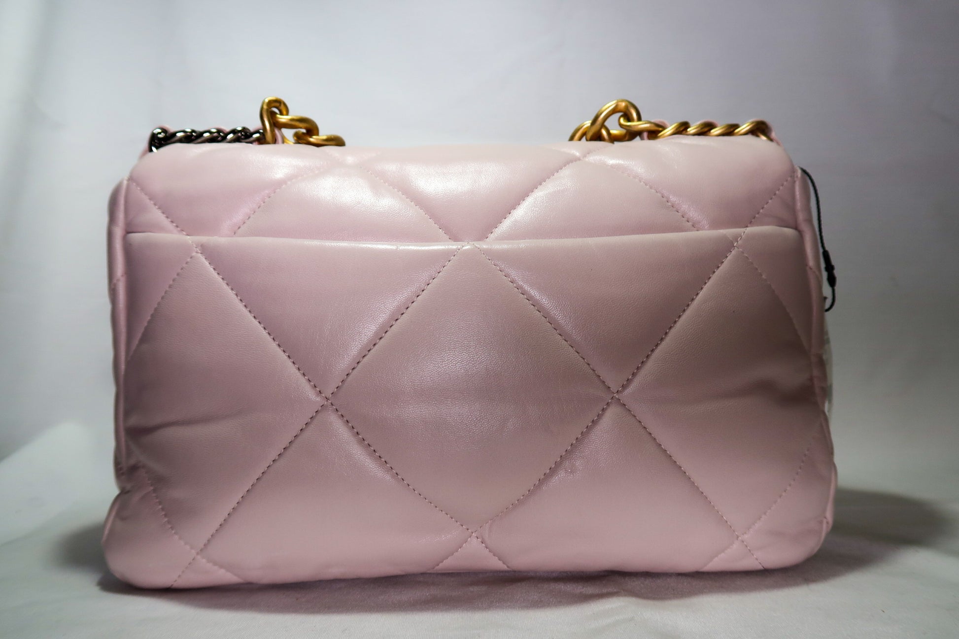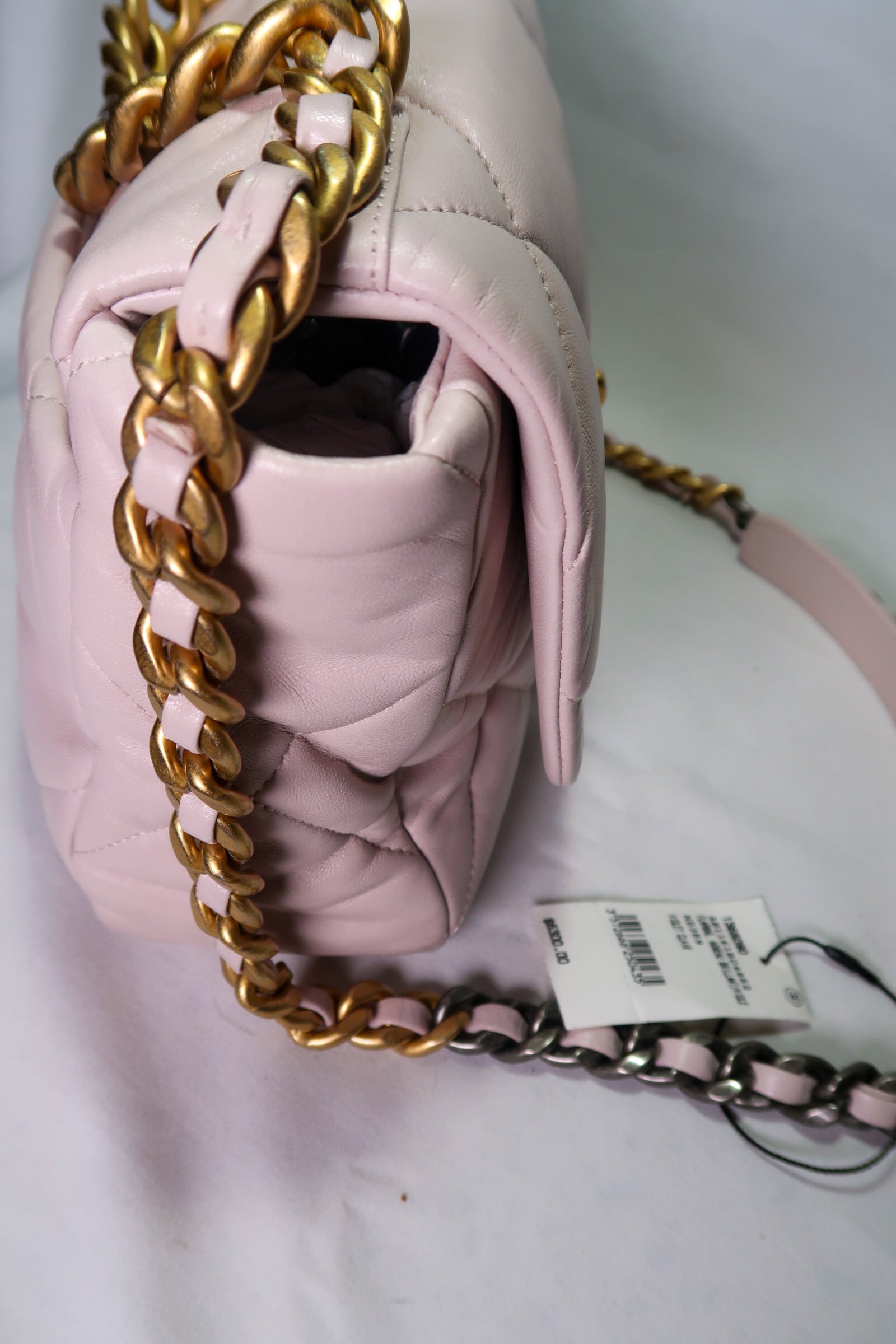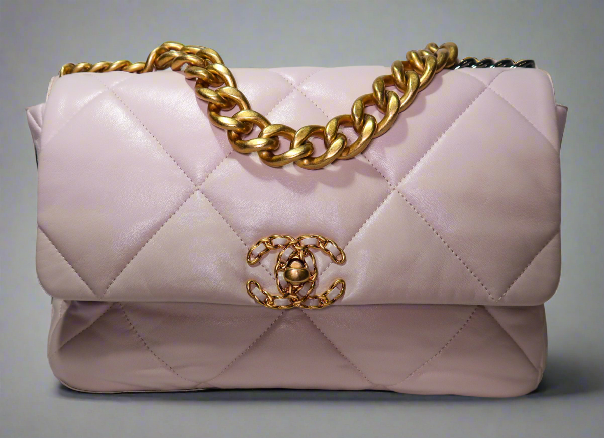 This Chanel 19 Medium Flap Bag is a modern reinterpretation of the classic flap, crafted in buttery soft light pink lambskin leather with signature oversized diamond quilting. It features the iconic double CC logo on the front, woven with mixed metal chain detailing. The bag includes a chunky gold-tone chain top handle, along with a leather-threaded shoulder strap in mixed gold, silver, and ruthenium-tone hardware — a hallmark of the Chanel 19 line. Elegant and fashion-forward, this versatile piece can be worn by hand, on the shoulder, or crossbody.