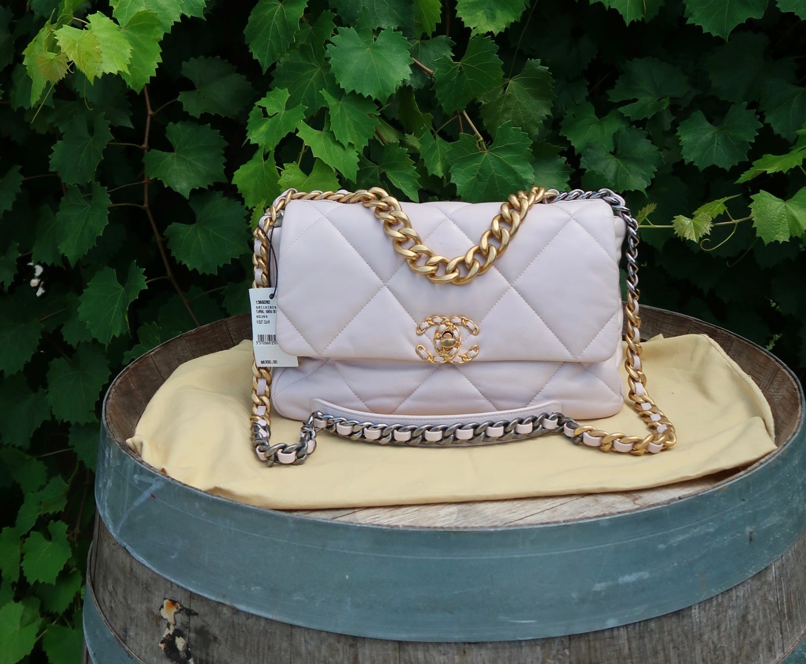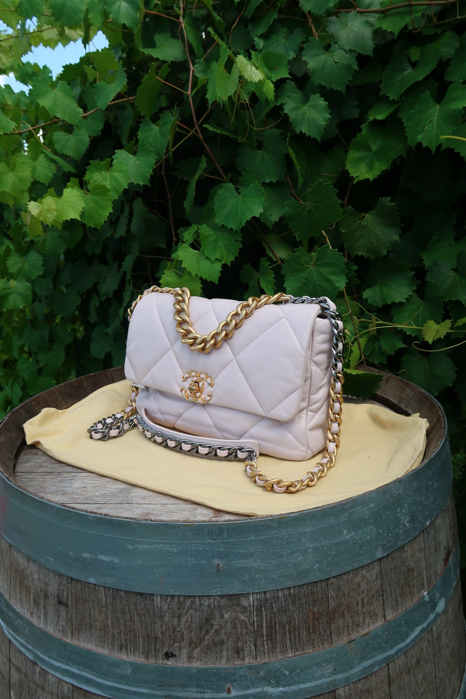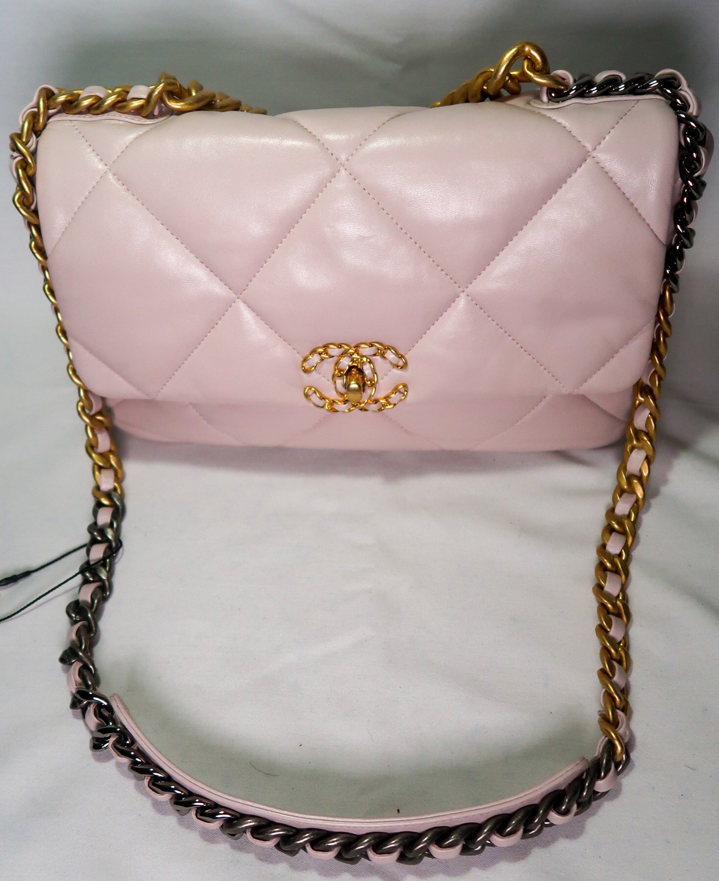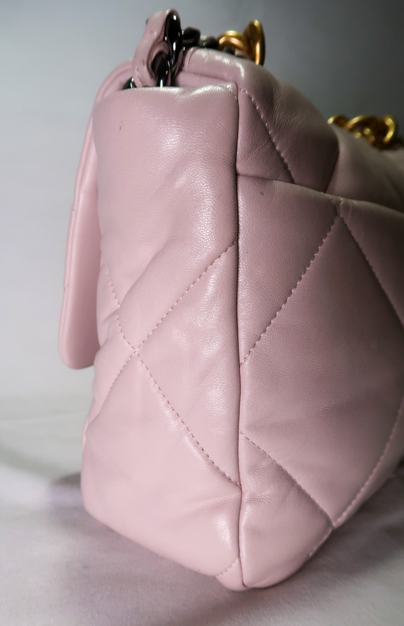 This Chanel 19 Medium Flap Bag is a modern reinterpretation of the classic flap, crafted in buttery soft light pink lambskin leather with signature oversized diamond quilting. It features the iconic double CC logo on the front, woven with mixed metal chain detailing. The bag includes a chunky gold-tone chain top handle, along with a leather-threaded shoulder strap in mixed gold, silver, and ruthenium-tone hardware — a hallmark of the Chanel 19 line. Elegant and fashion-forward, this versatile piece can be worn by hand, on the shoulder, or crossbody.