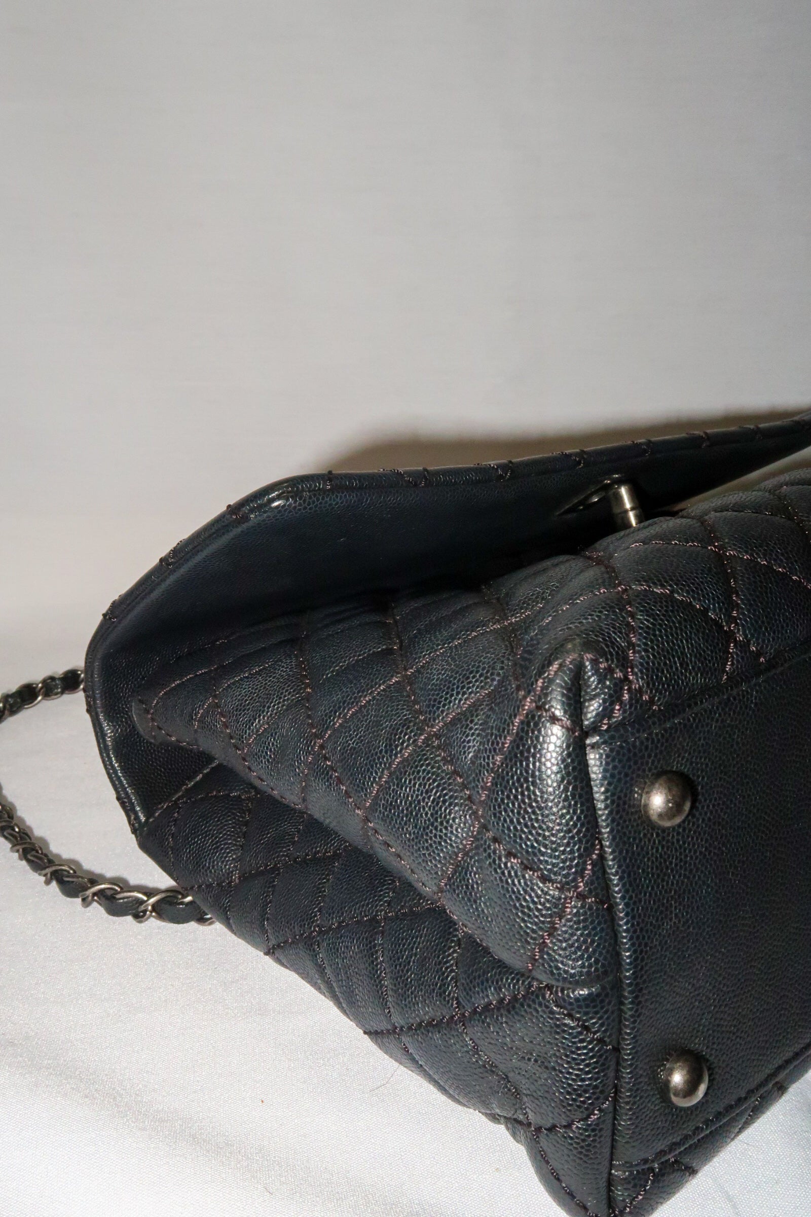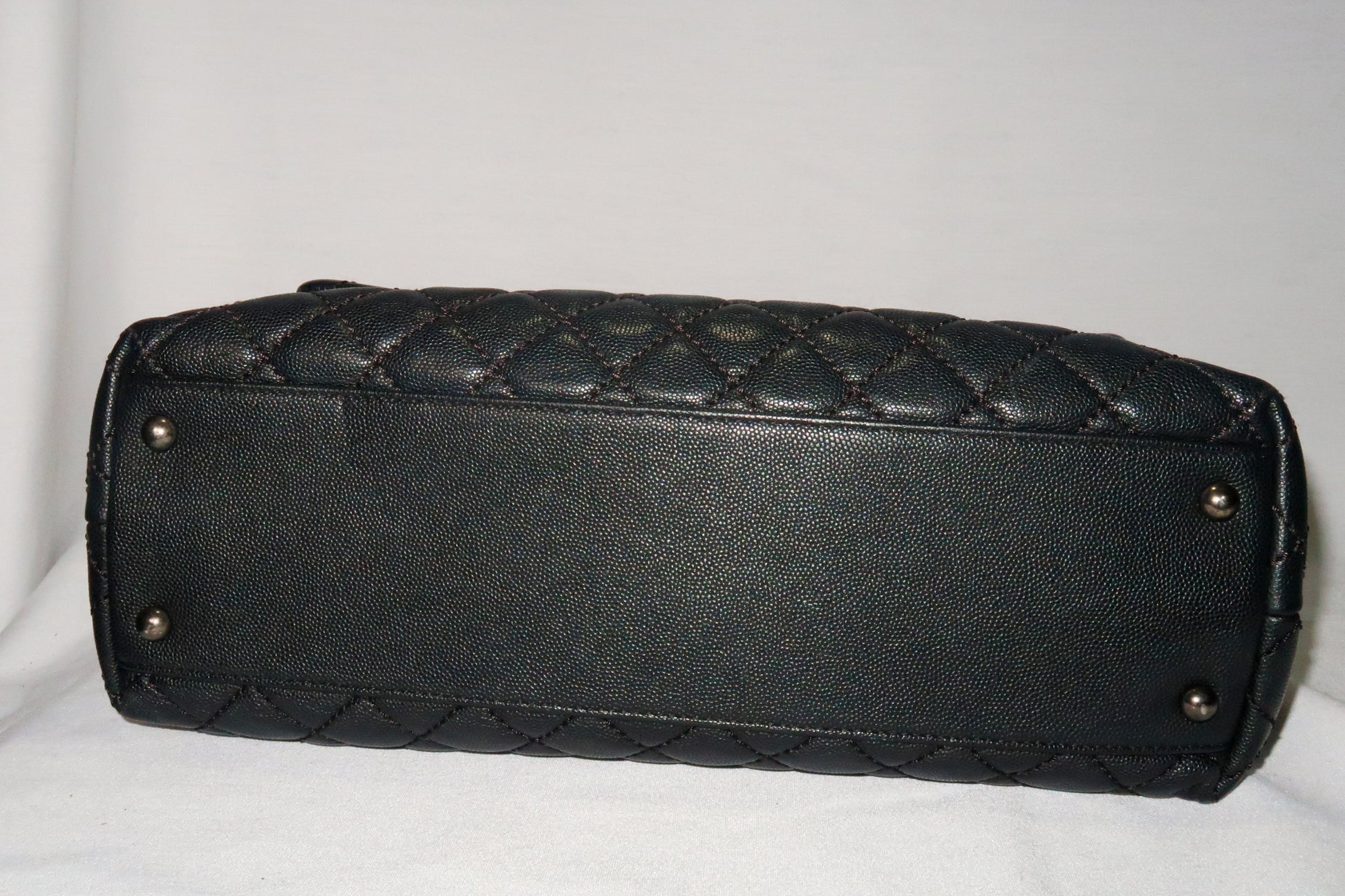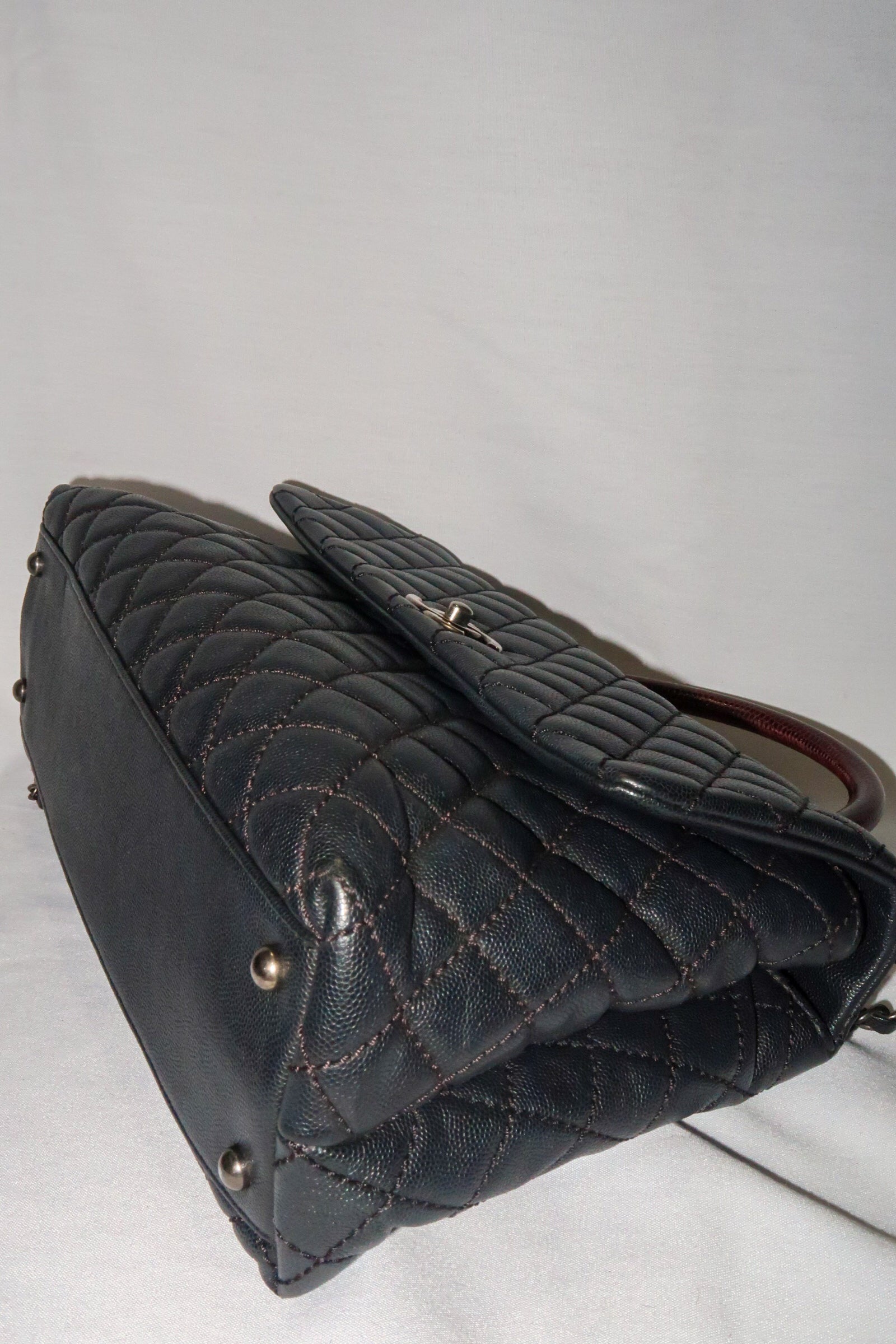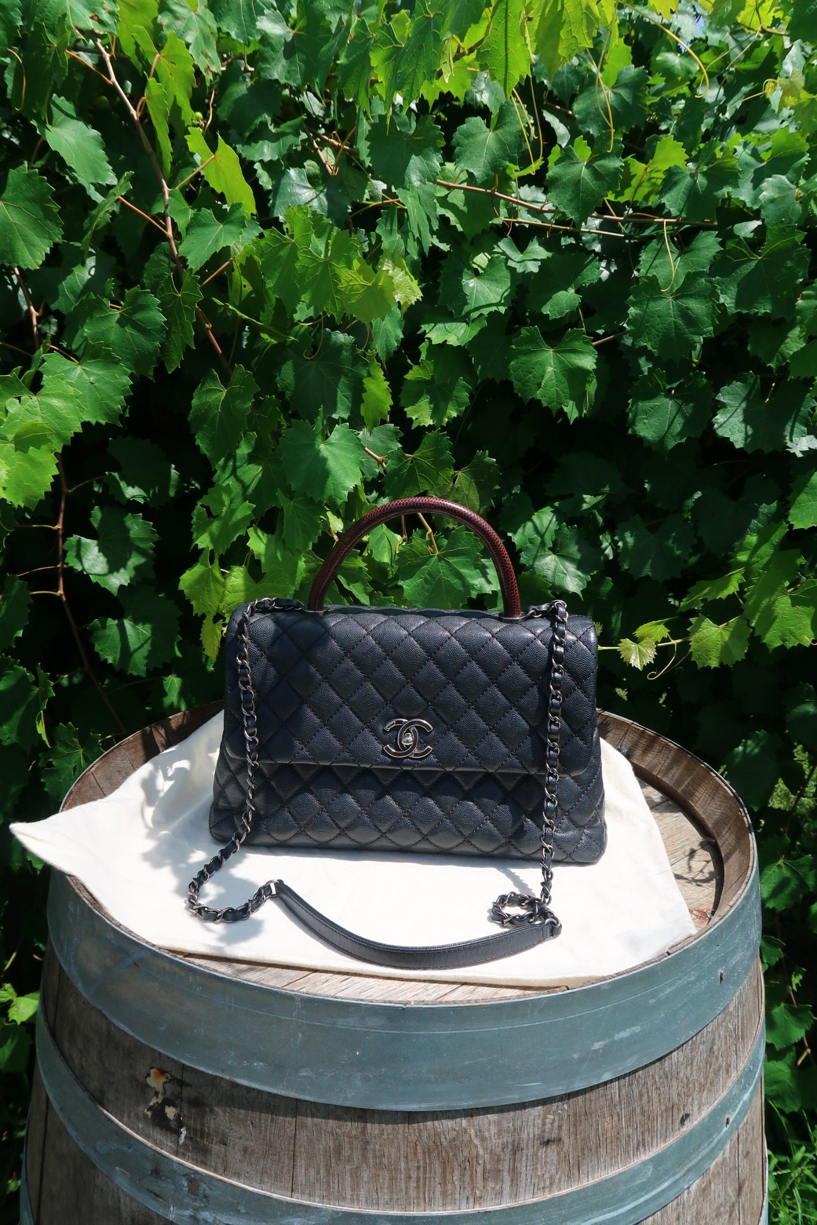 Timeless elegance meets contemporary structure in this Chanel Coco Handle Flap Bag. Crafted in durable black caviar leather with signature diamond quilting, the bag features a striking burgundy lizard-embossed top handle and a sleek flap closure with the iconic interlocking CC turn-lock in aged ruthenium-tone hardware. The interior is organized for everyday practicality, while the leather-interlaced chain strap allows for shoulder or crossbody wear. A luxurious and highly sought-after piece, perfect for both day and evening wear.