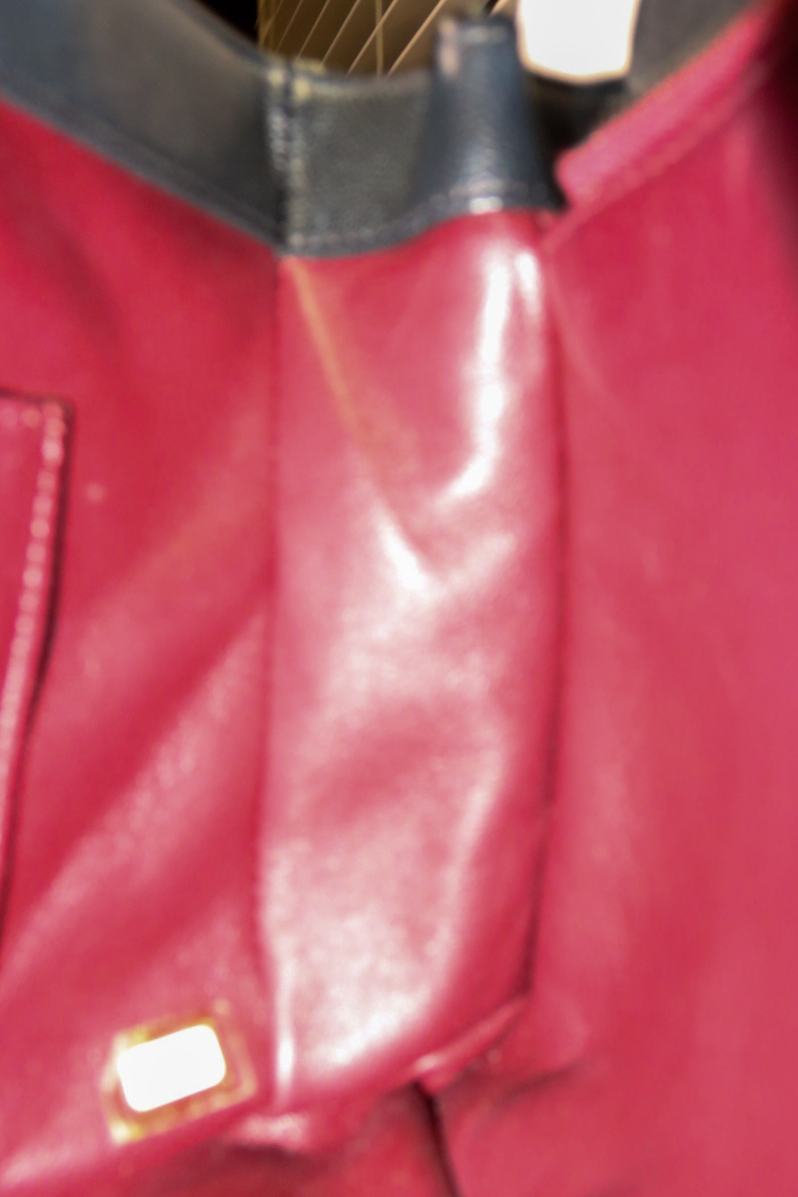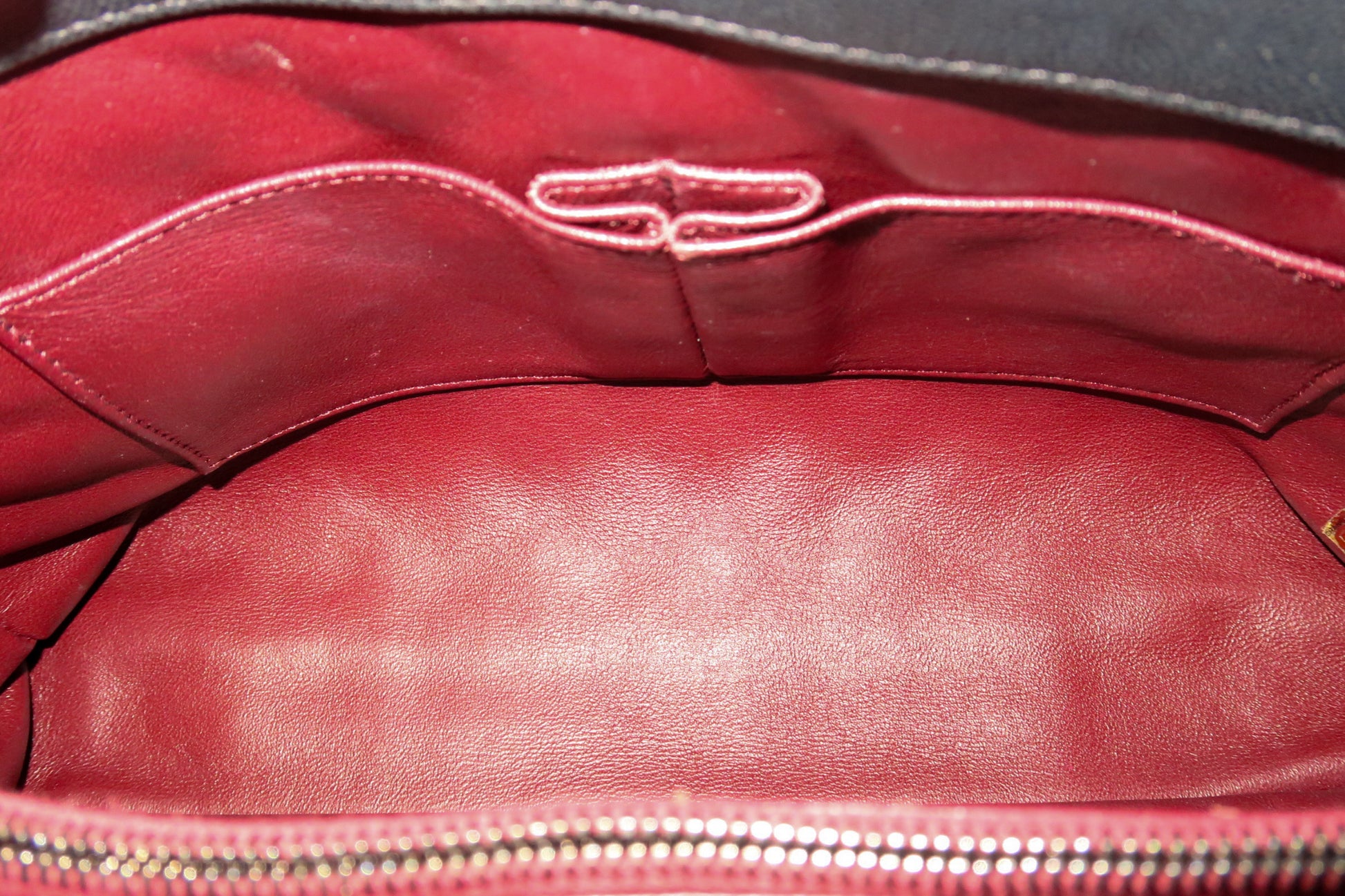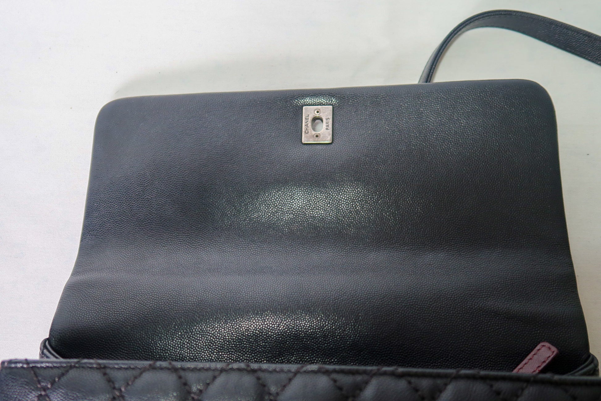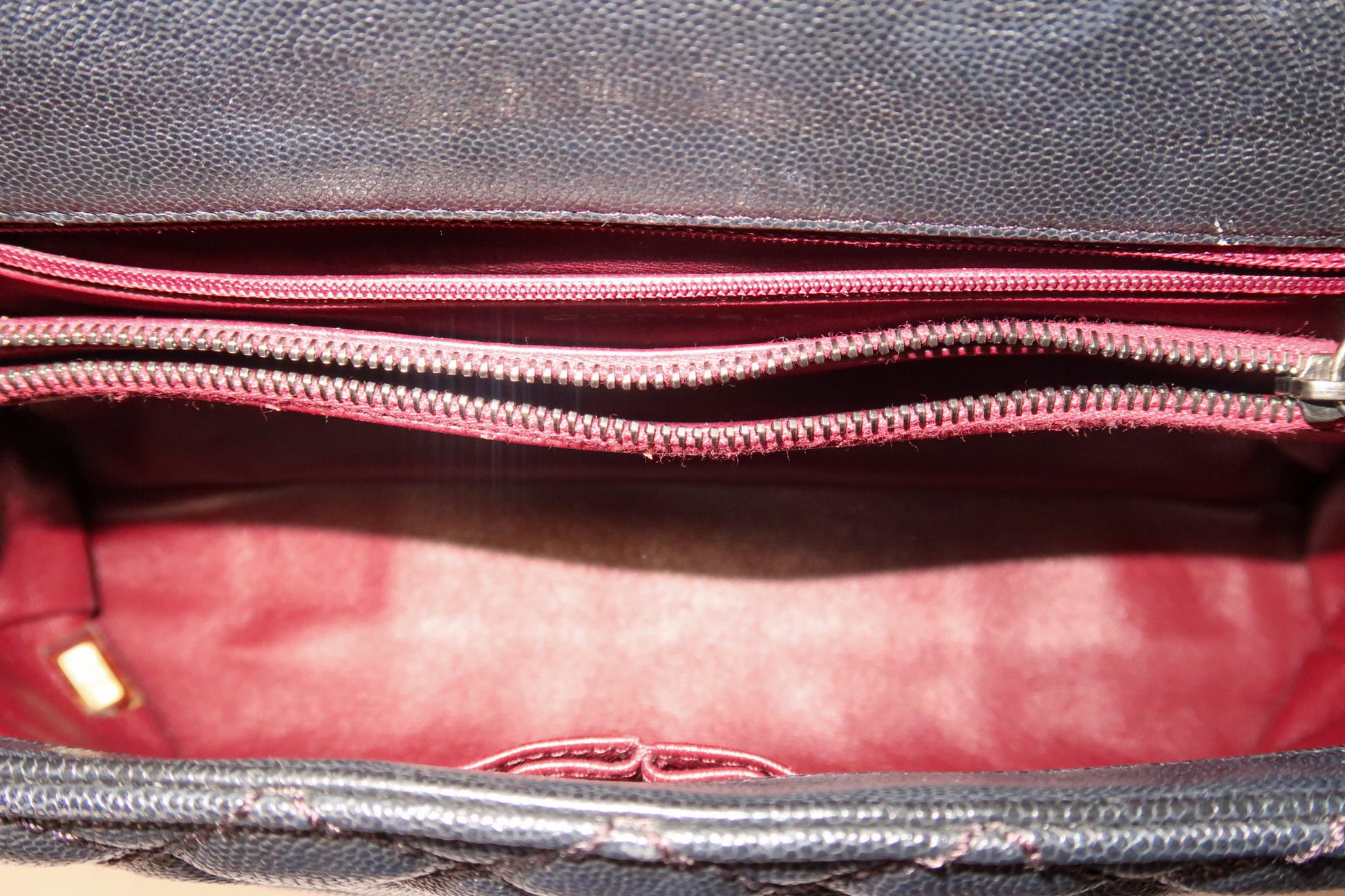 Timeless elegance meets contemporary structure in this Chanel Coco Handle Flap Bag. Crafted in durable black caviar leather with signature diamond quilting, the bag features a striking burgundy lizard-embossed top handle and a sleek flap closure with the iconic interlocking CC turn-lock in aged ruthenium-tone hardware. The interior is organized for everyday practicality, while the leather-interlaced chain strap allows for shoulder or crossbody wear. A luxurious and highly sought-after piece, perfect for both day and evening wear.