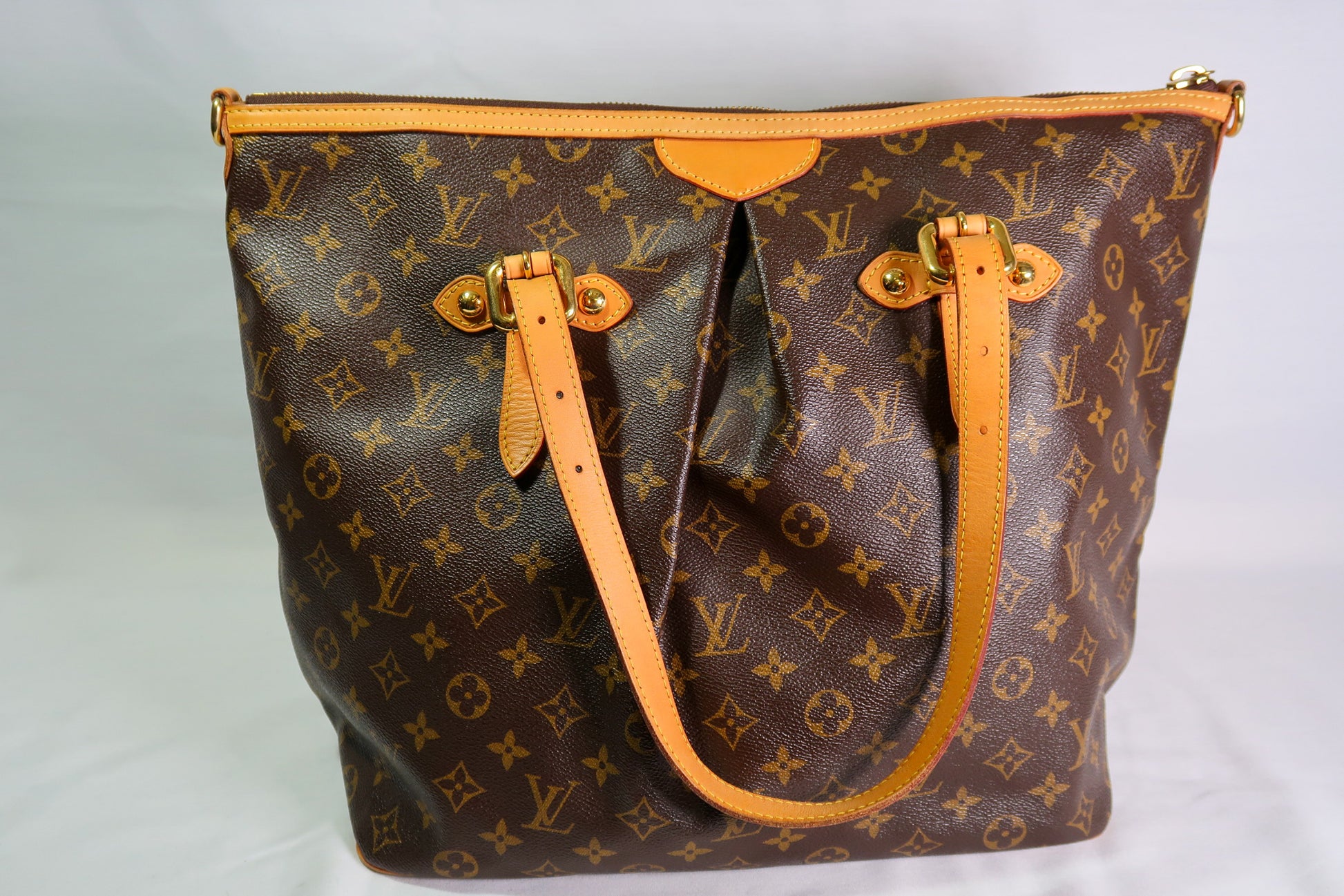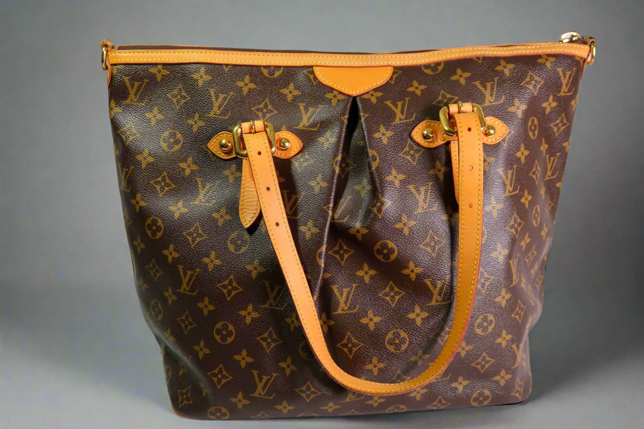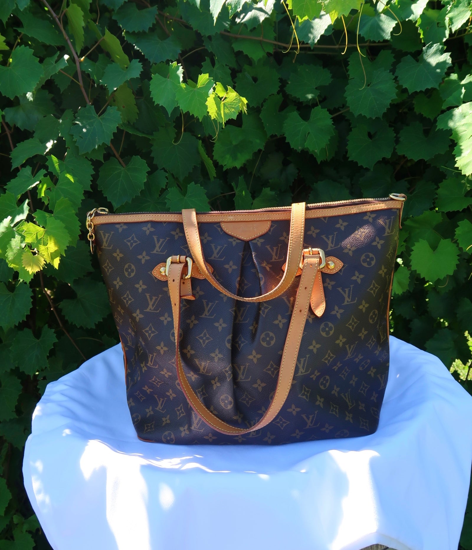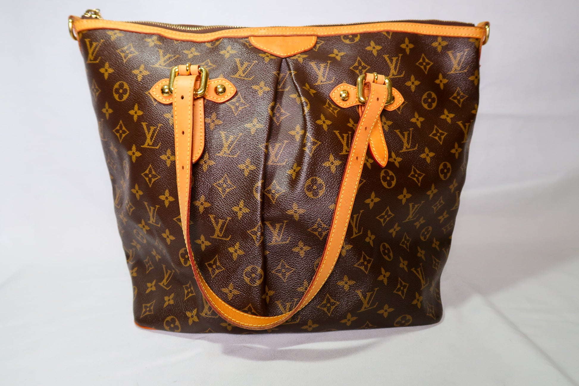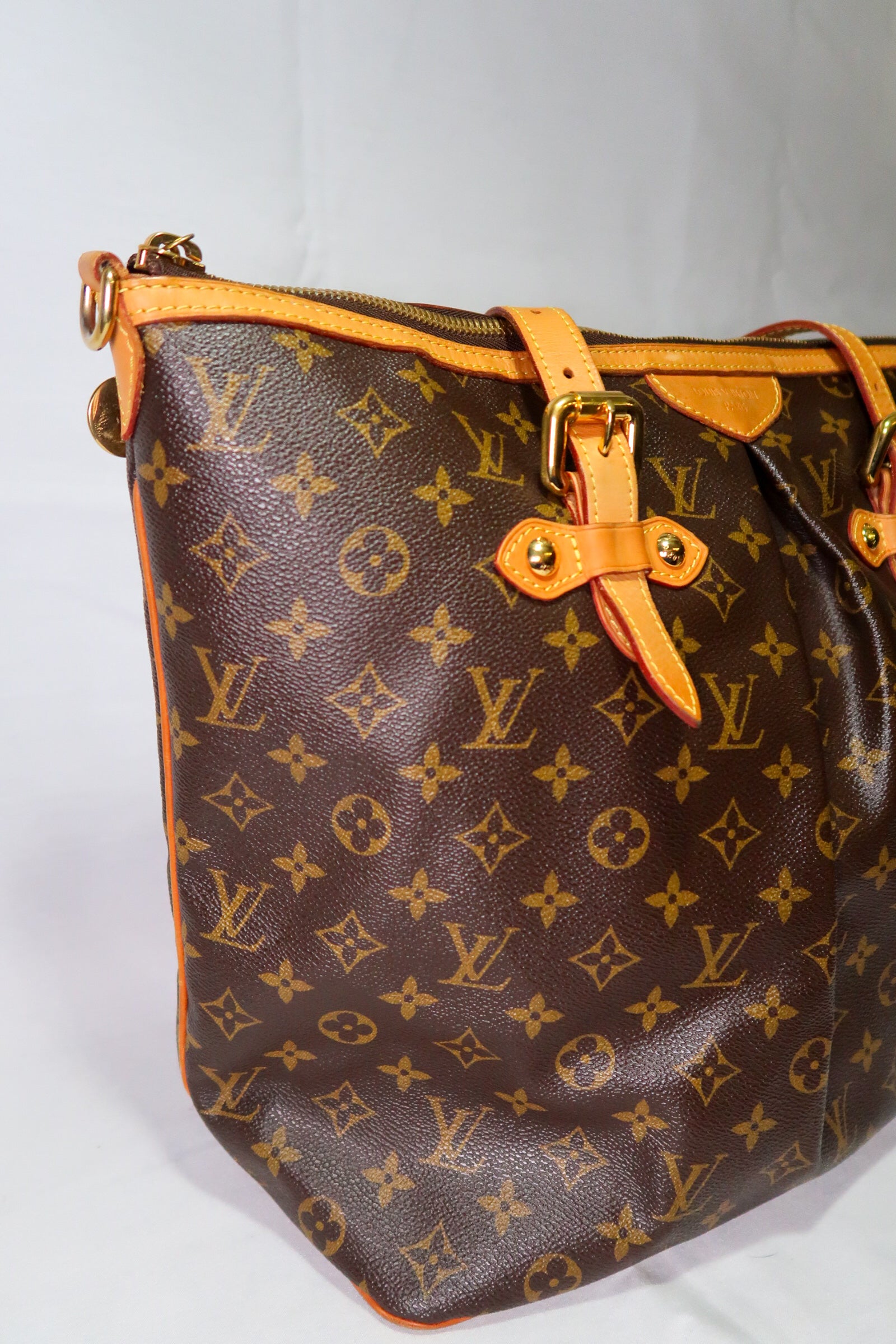 This is a secondhand authentic Louis Vuitton Palermo GM in Monogram Canvas. This chic tote features pleated details, vachetta leather trim, and gold-tone hardware with a zip-top closure. Its spacious interior with multiple compartments makes it the perfect day-to-day carryall or travel companion.