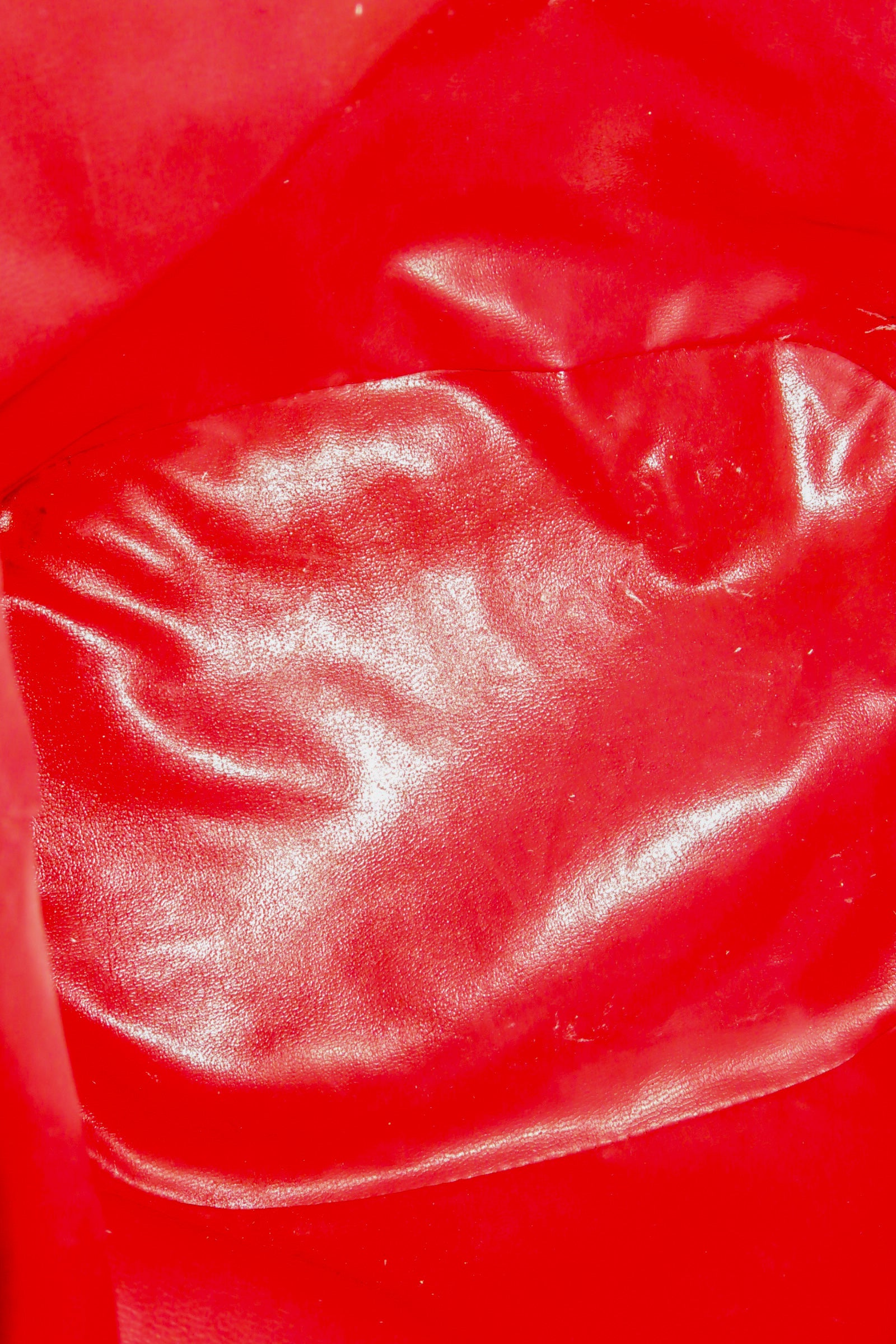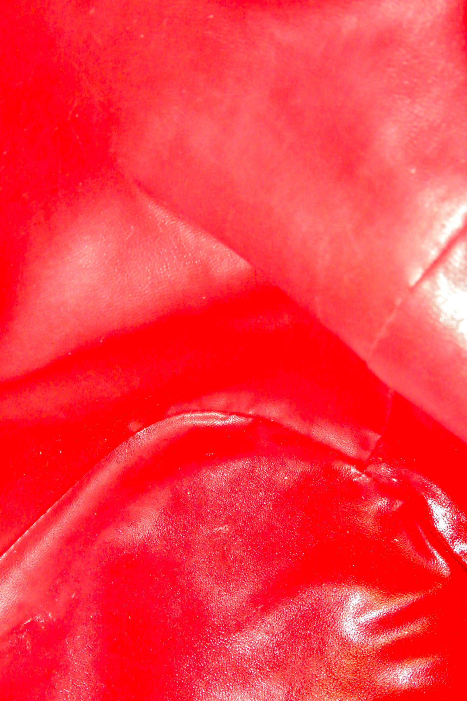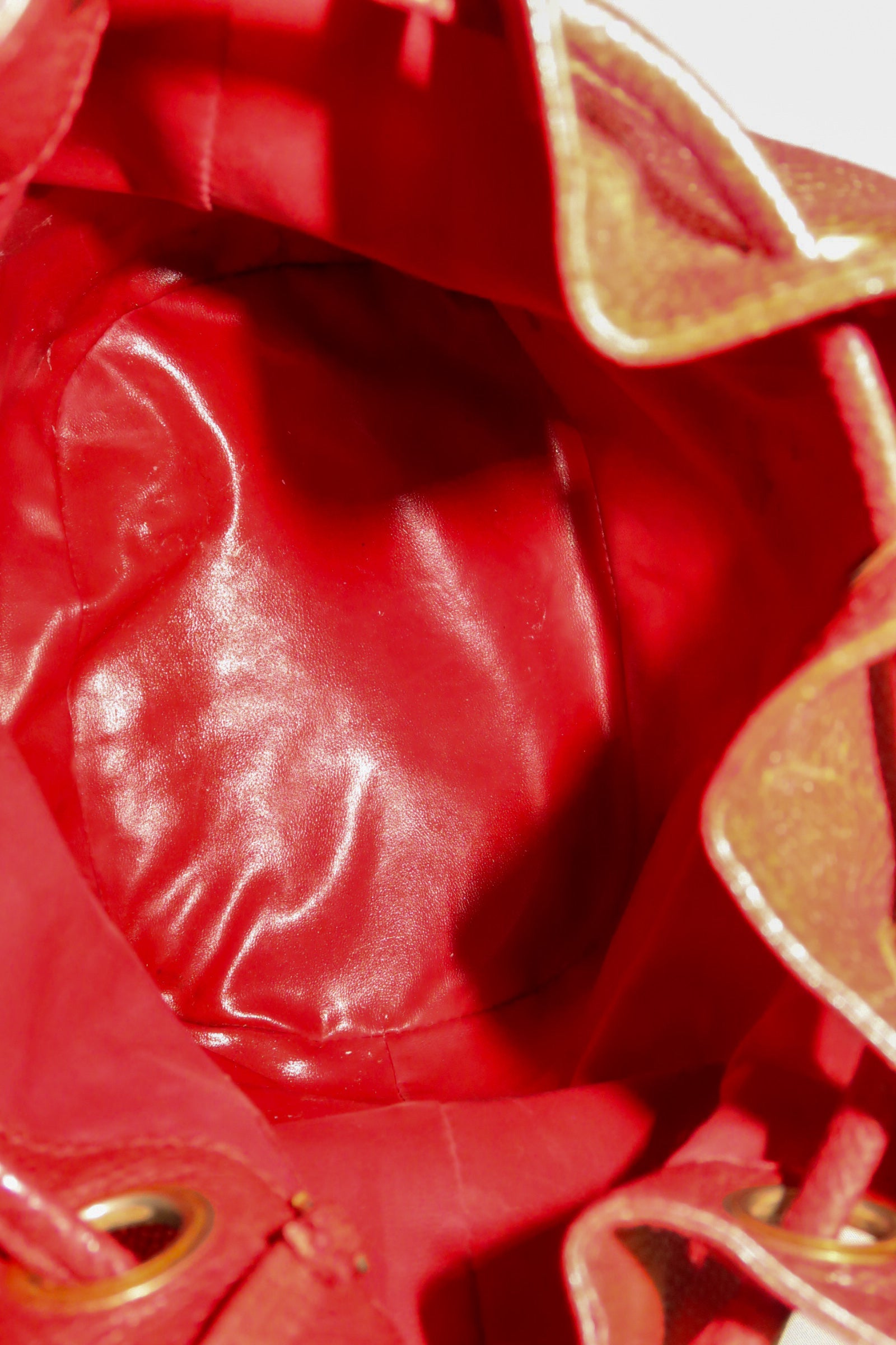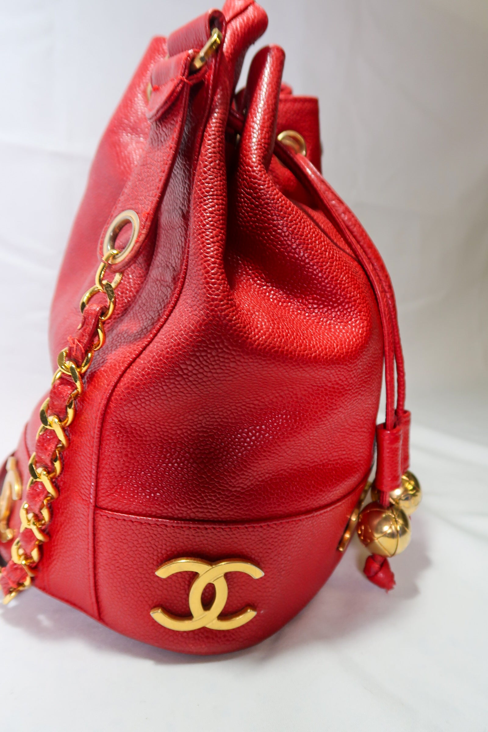 Vintage pre-owned early 90s Chanel small bucket bag crafted in red Caviar leather, featuring gold-plated 'CC' logo hardware along the base and finished with chain link detail on the strap.