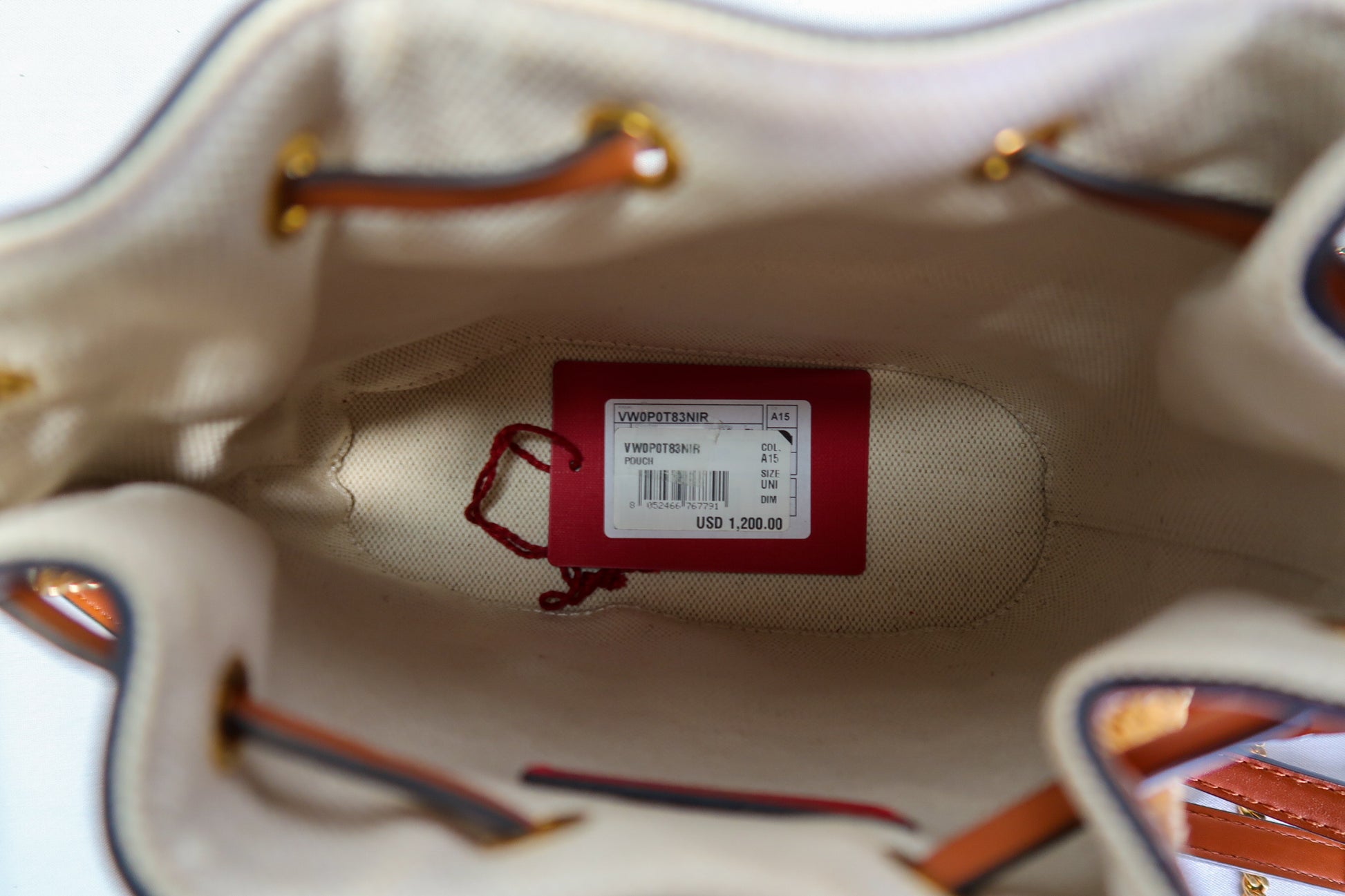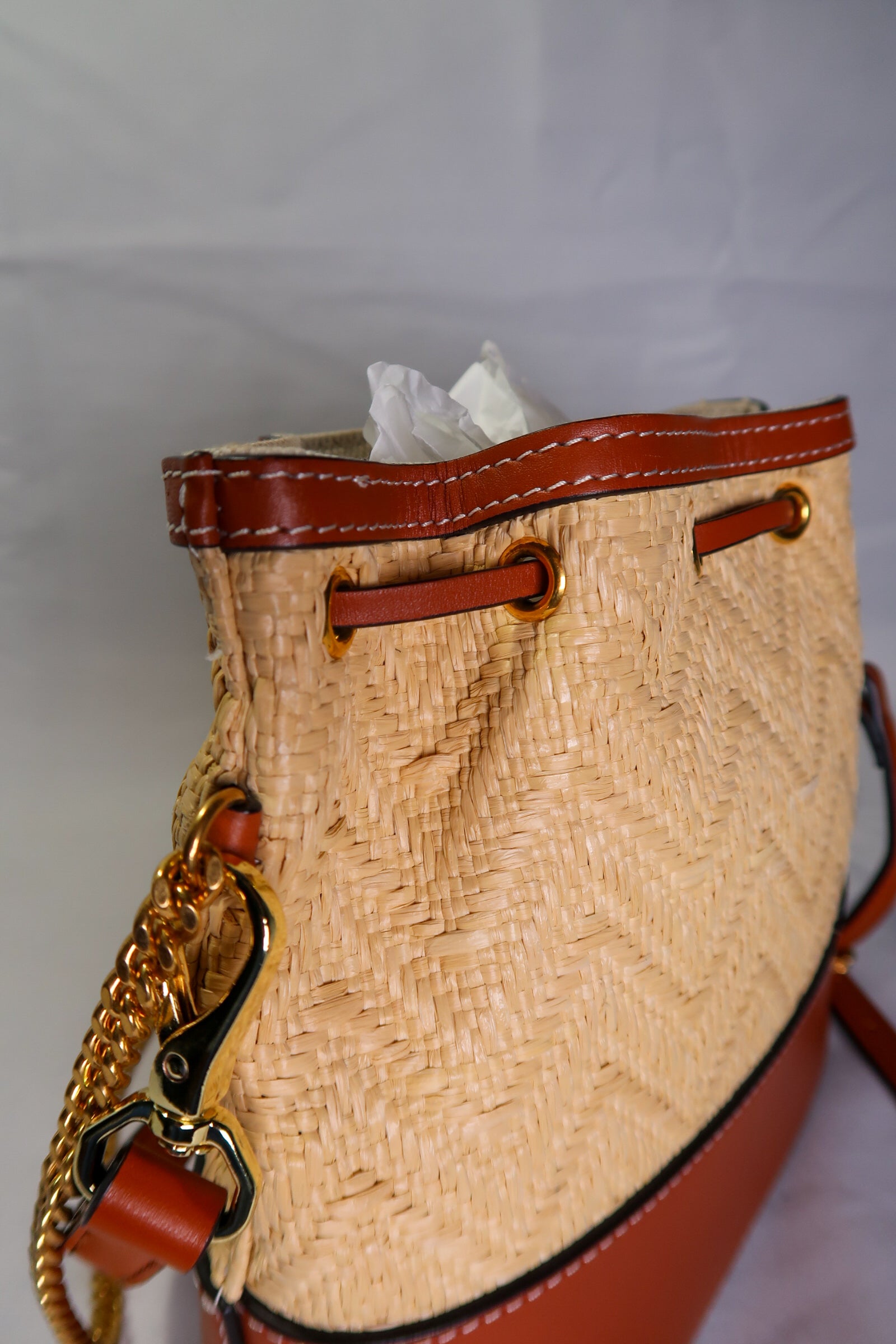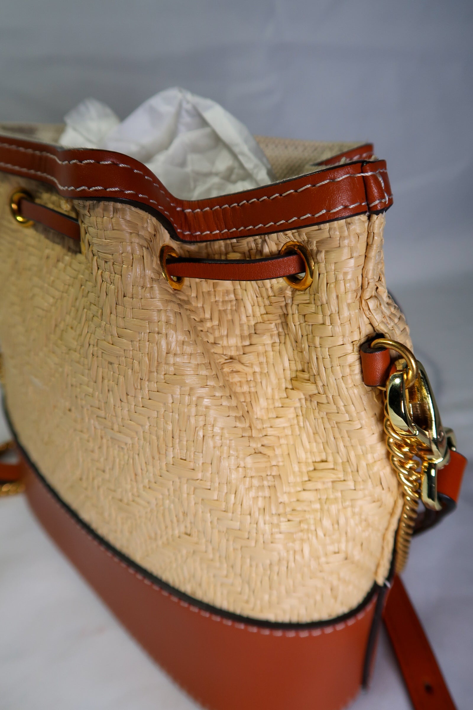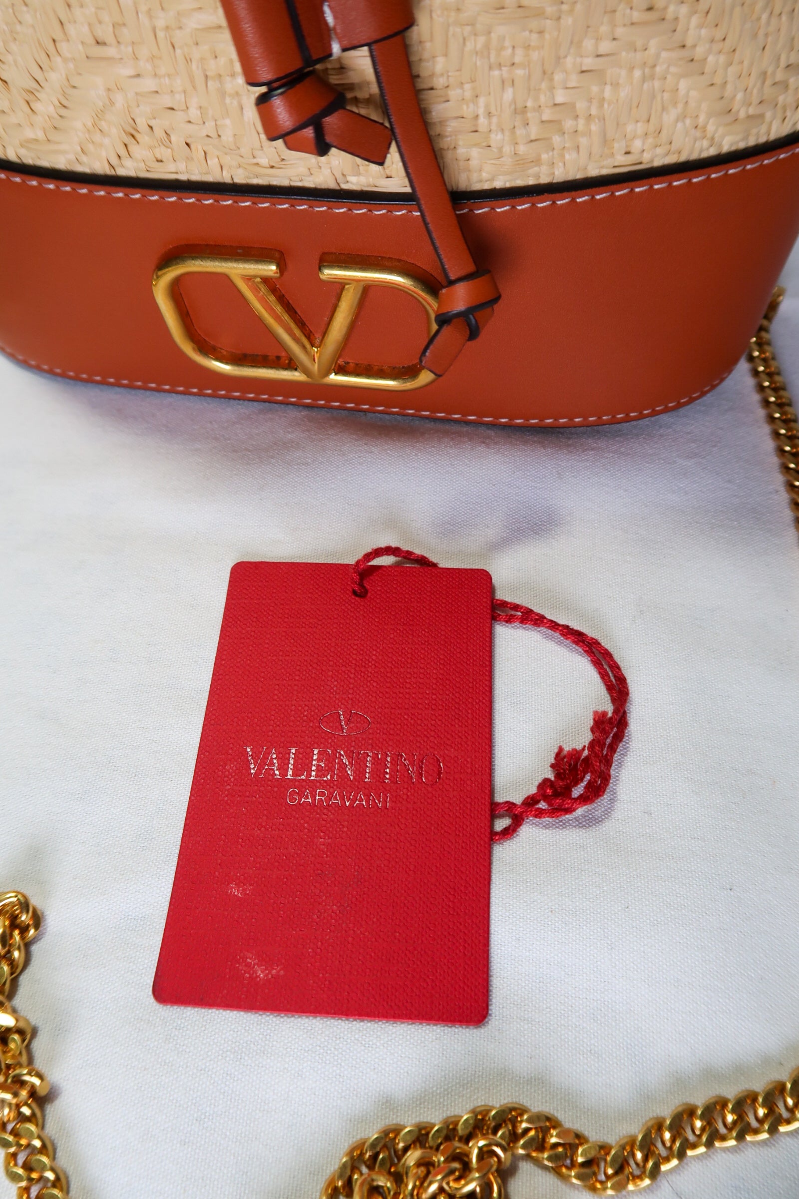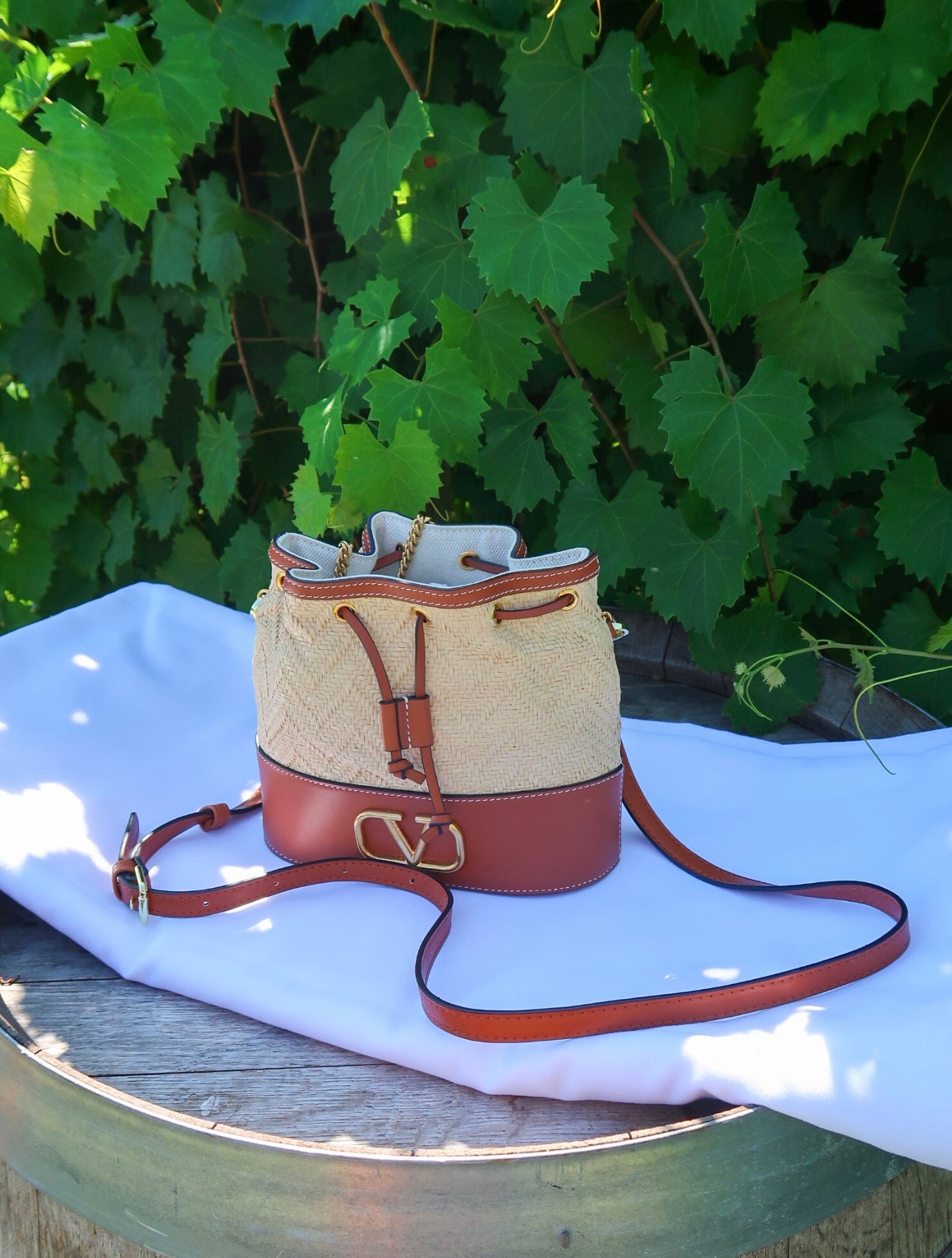 VALENTINO GARAVANI Raffia Calfskin Vlogo Drawstring Shoulder Bag Natural. This stylish drawstring bag is crafted of raffia fabric and tan calfskin leather trim. The top opens to a light beige fabric interior.