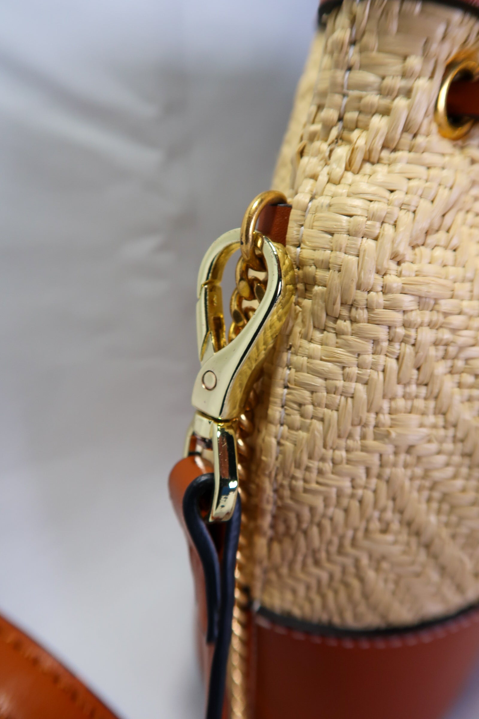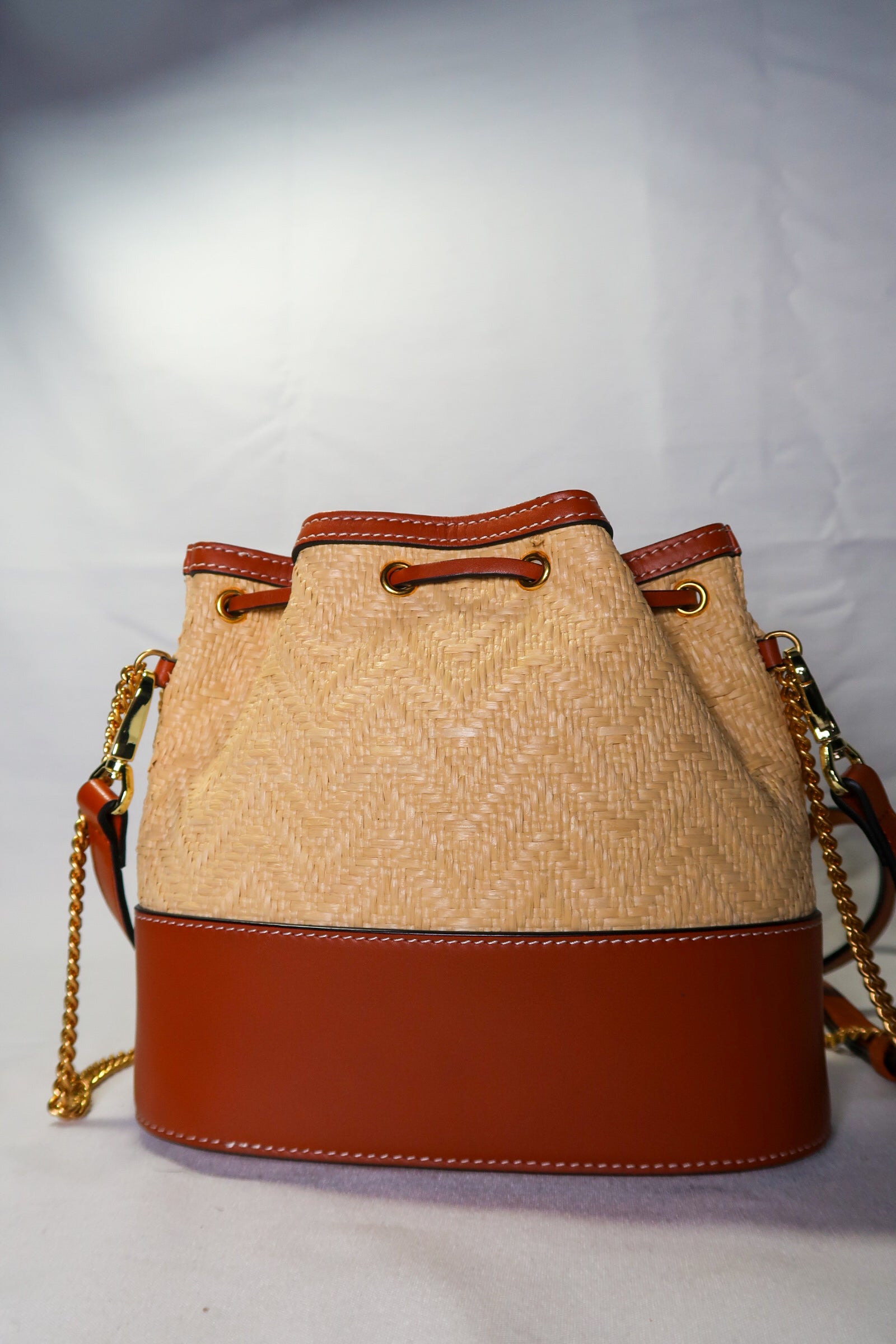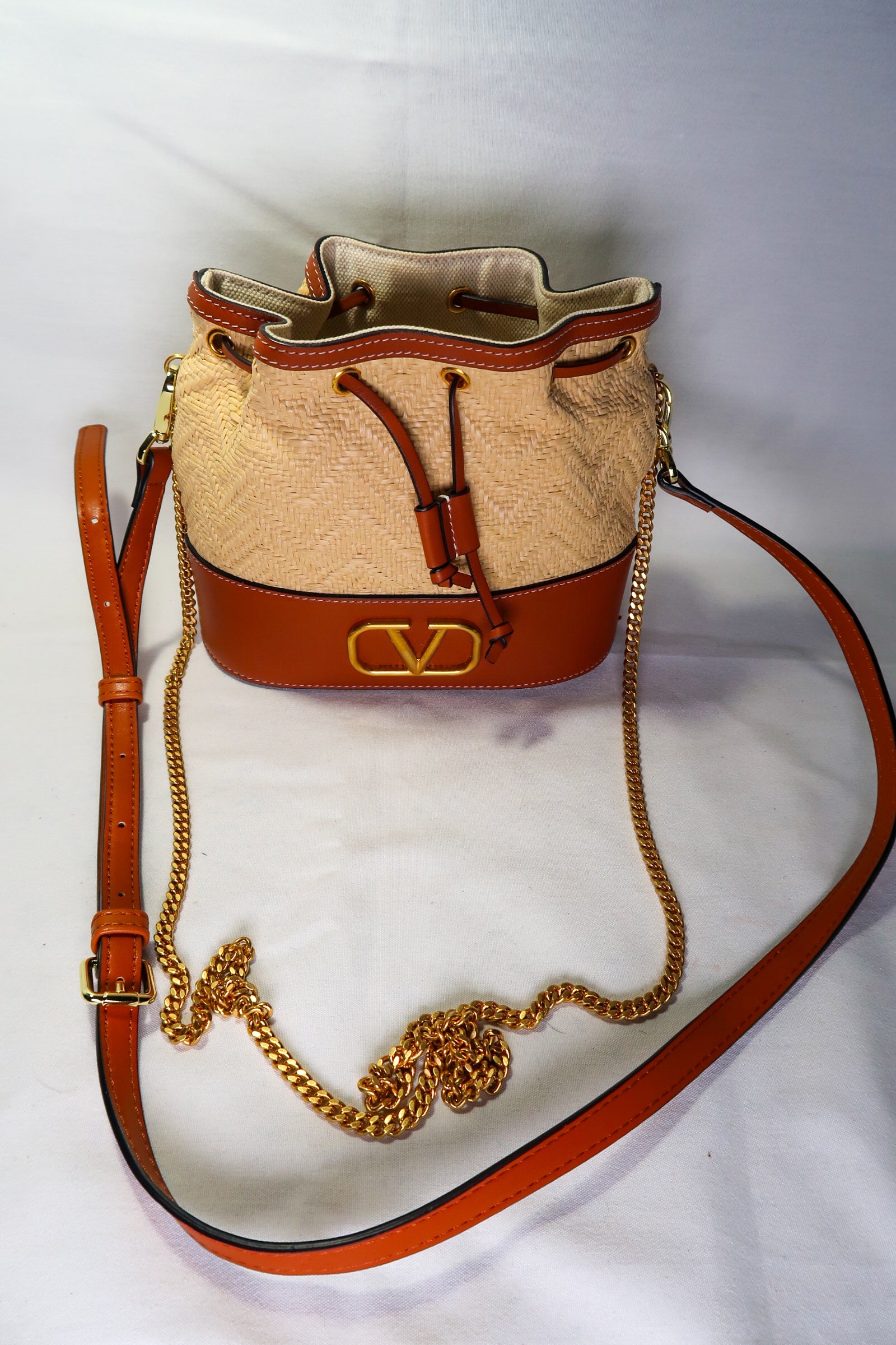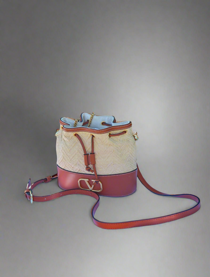 Valentino Garavani Raffia Calfskin Vlogo Drawstring Shoulder Bag Naturale Saddle Brown