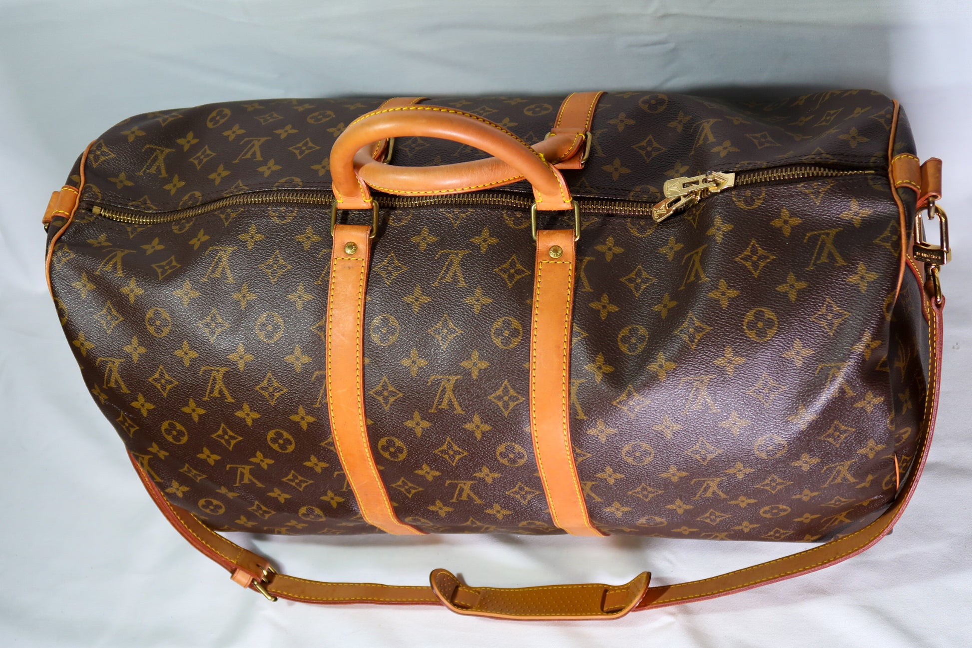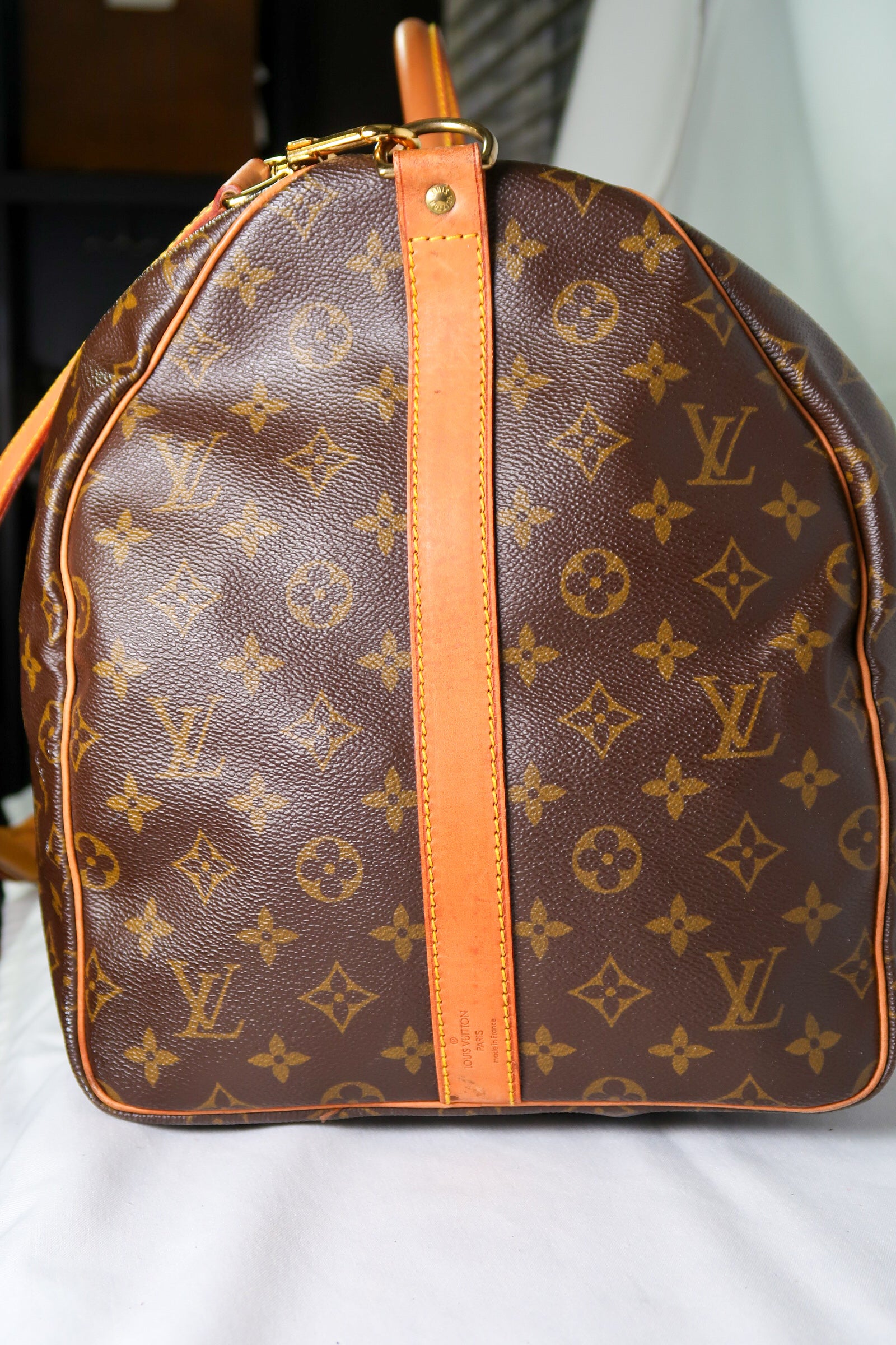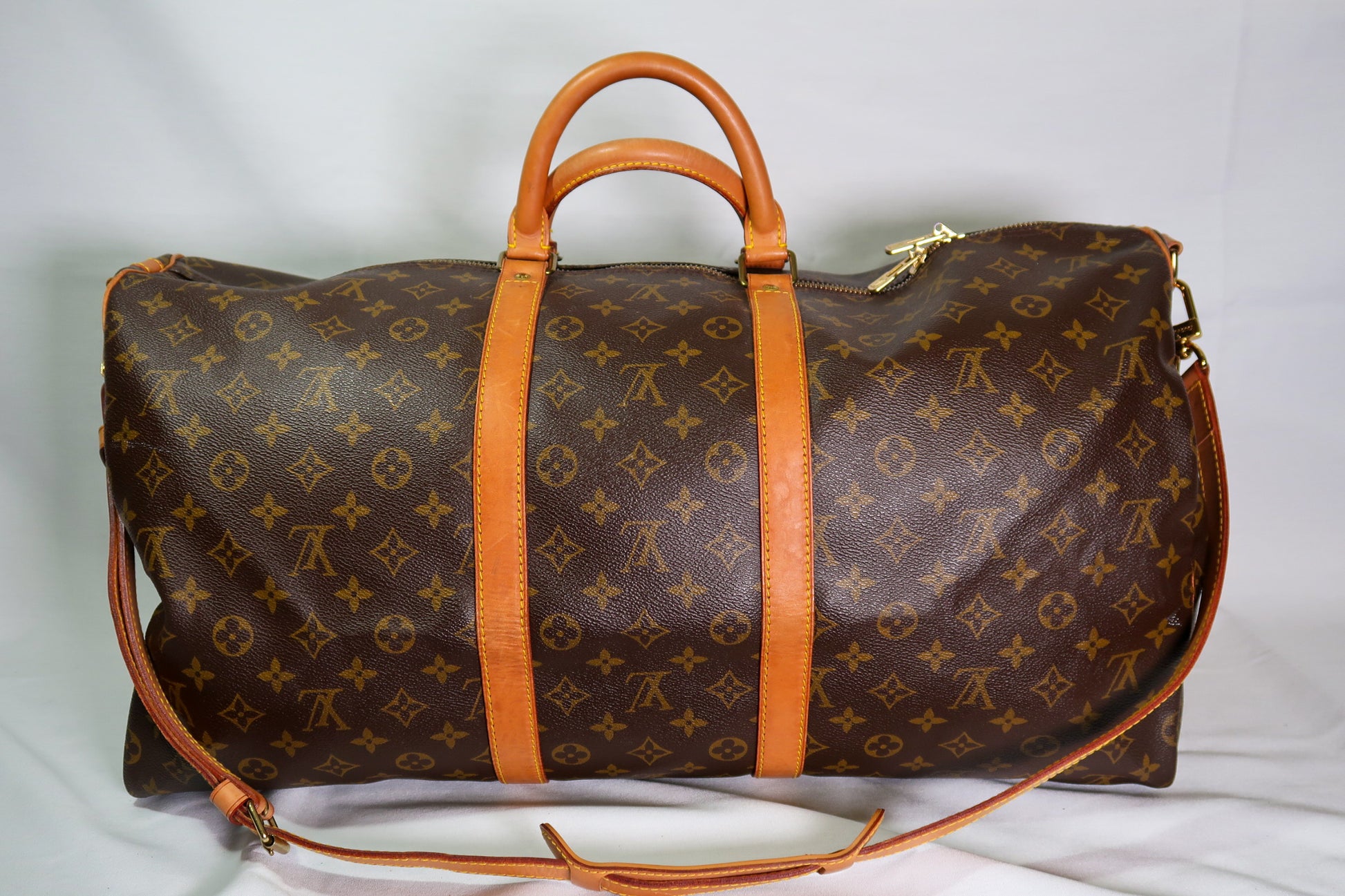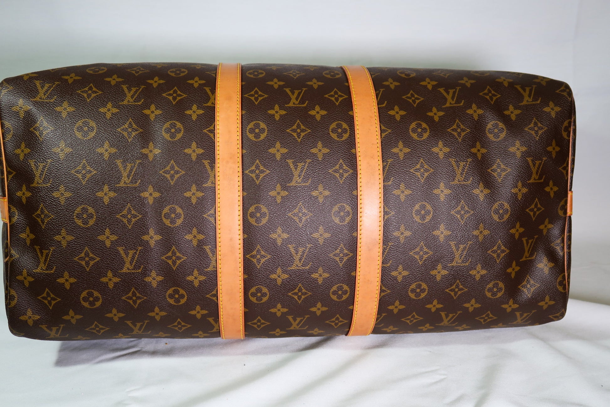 This is a pre-owned Louis Vuitton Keepall Bandoulière 55 in Monogram Canvas, the largest size allowed for most carry-on airline travel. The Bandoulière edition includes a detachable strap for shoulder or crossbody wear. This timeless travel piece is ideal for weekend getaways and long-haul adventures alike, balancing luxury and practicality.