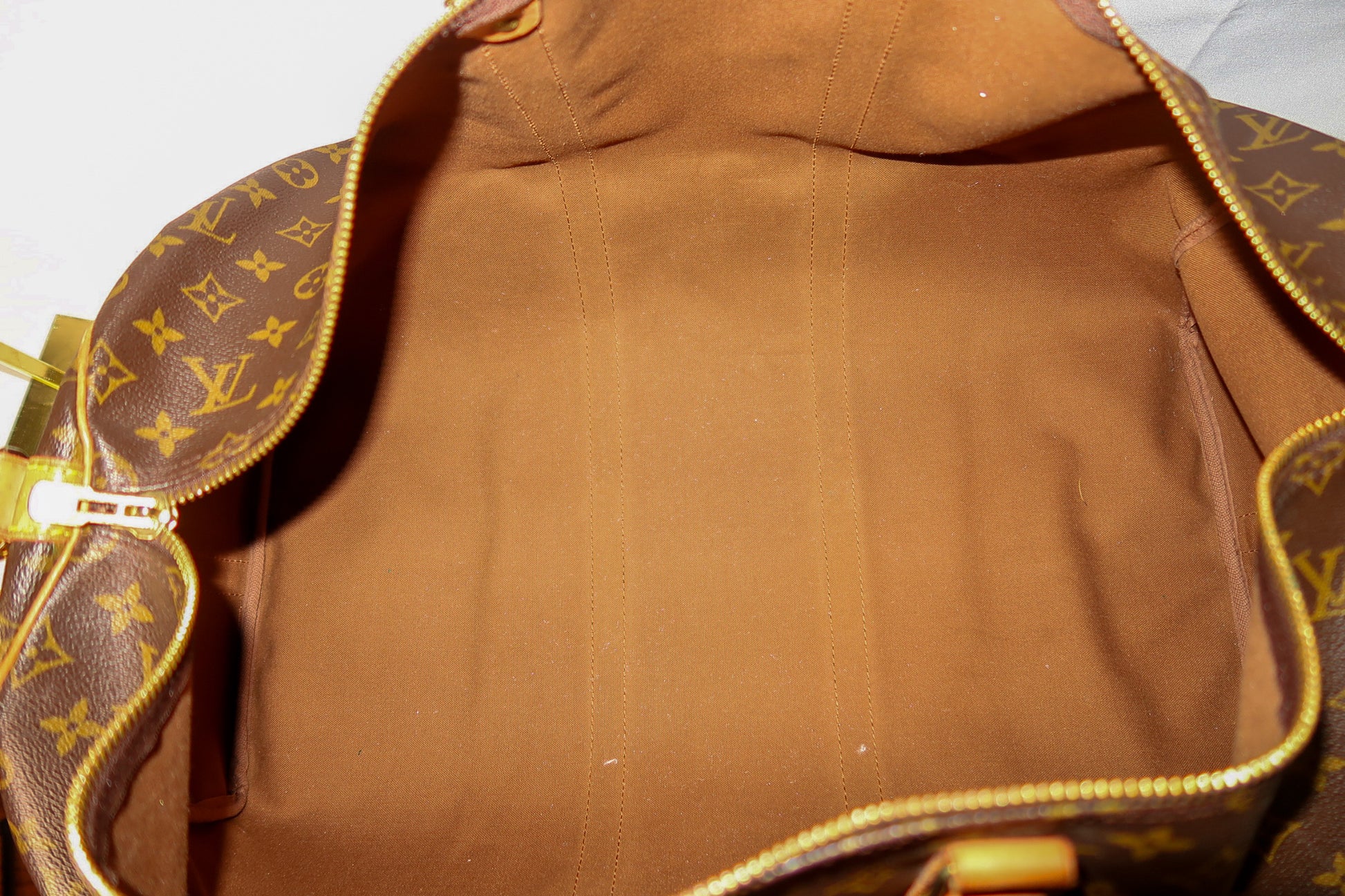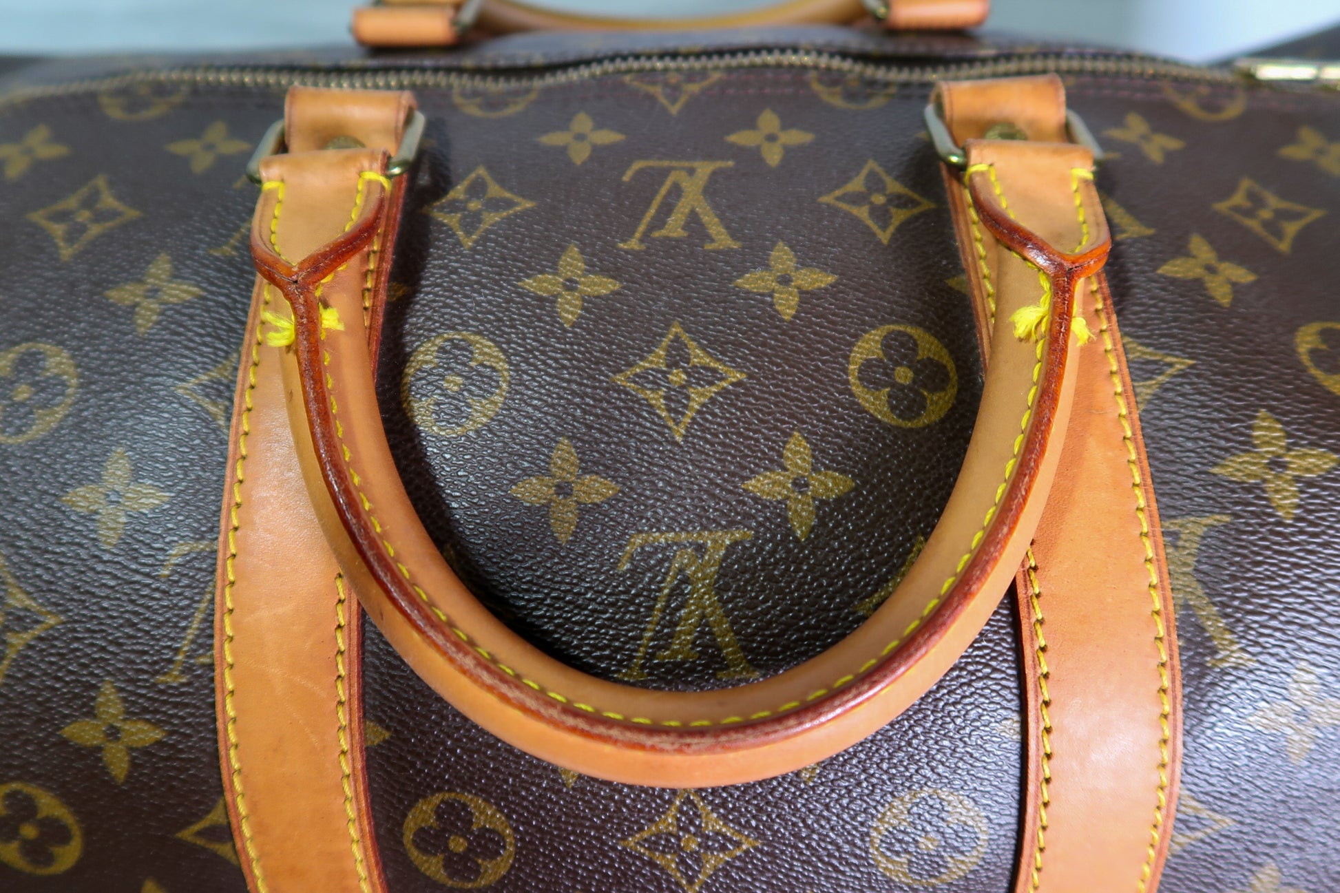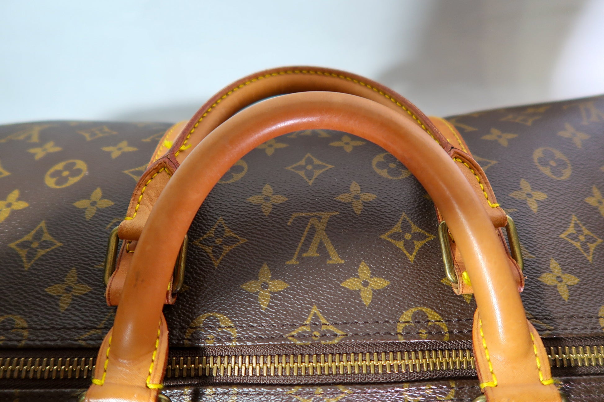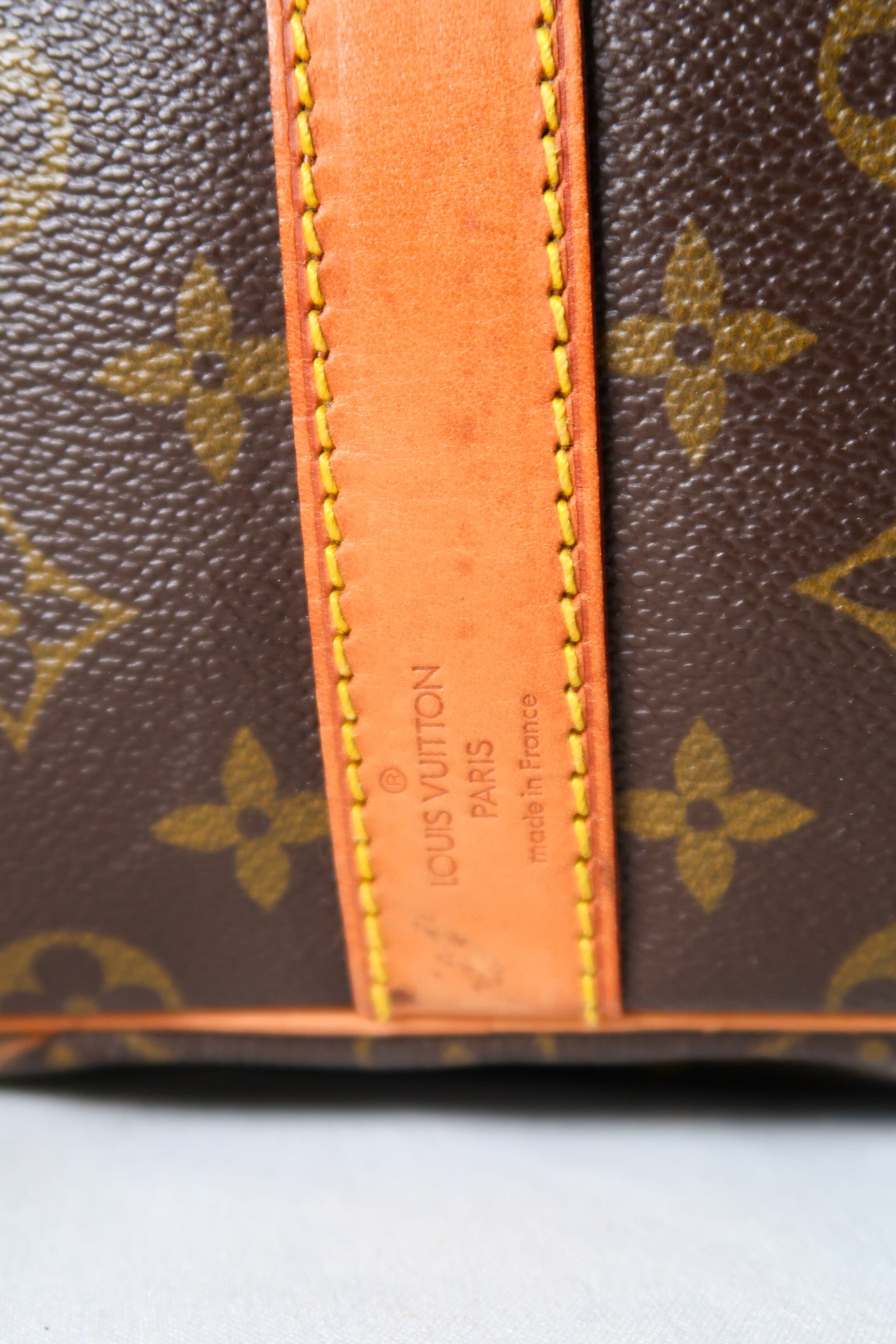 This is a pre-owned Louis Vuitton Keepall Bandoulière 55 in Monogram Canvas, the largest size allowed for most carry-on airline travel. The Bandoulière edition includes a detachable strap for shoulder or crossbody wear. This timeless travel piece is ideal for weekend getaways and long-haul adventures alike, balancing luxury and practicality.