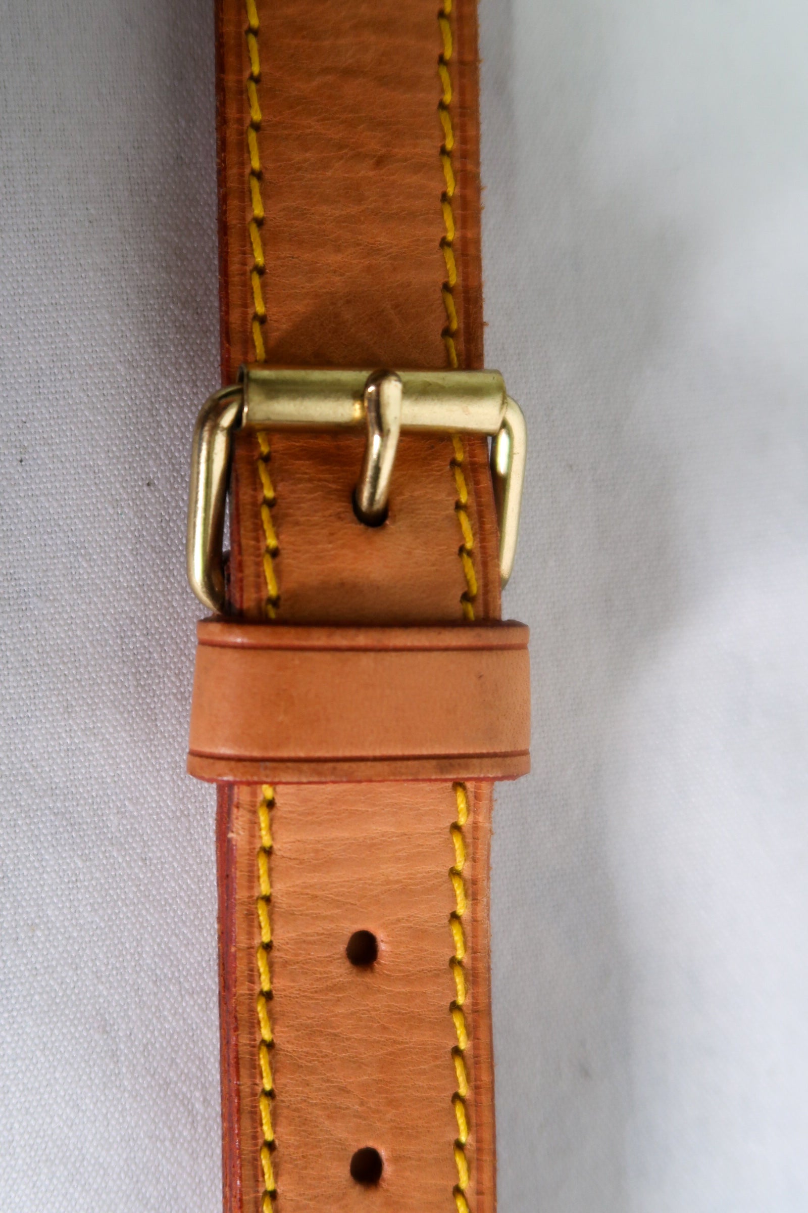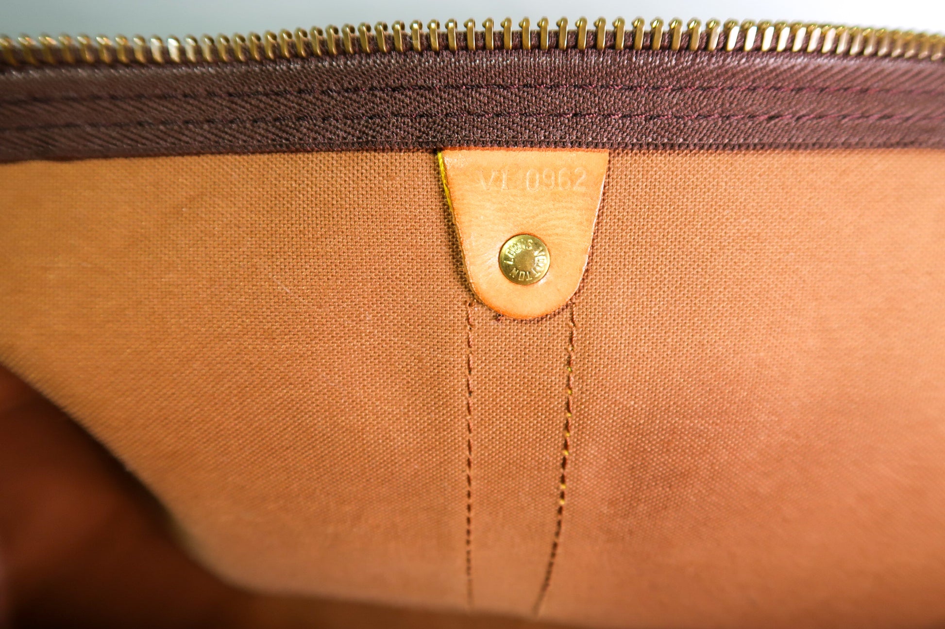 very good pre-owned condition: with clean monogram canvas, a honey patina to the leather, light watermarks and surface wear throughout, and minor darkening to the handles. The interior is clean with minimal signs of use, and hardware shows slight tarnishing and scratches from gentle wear.