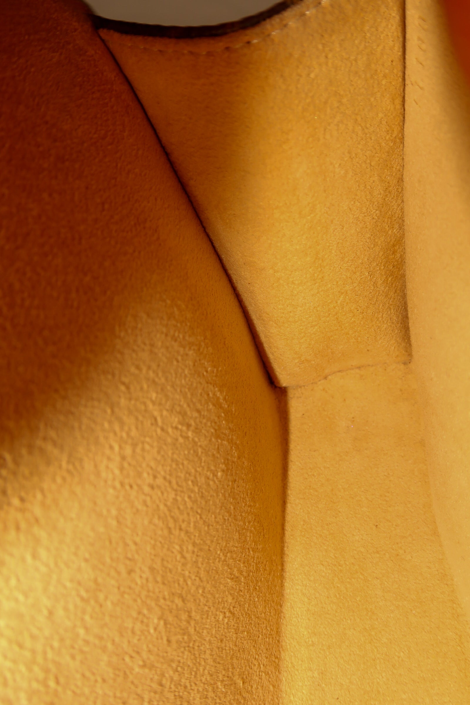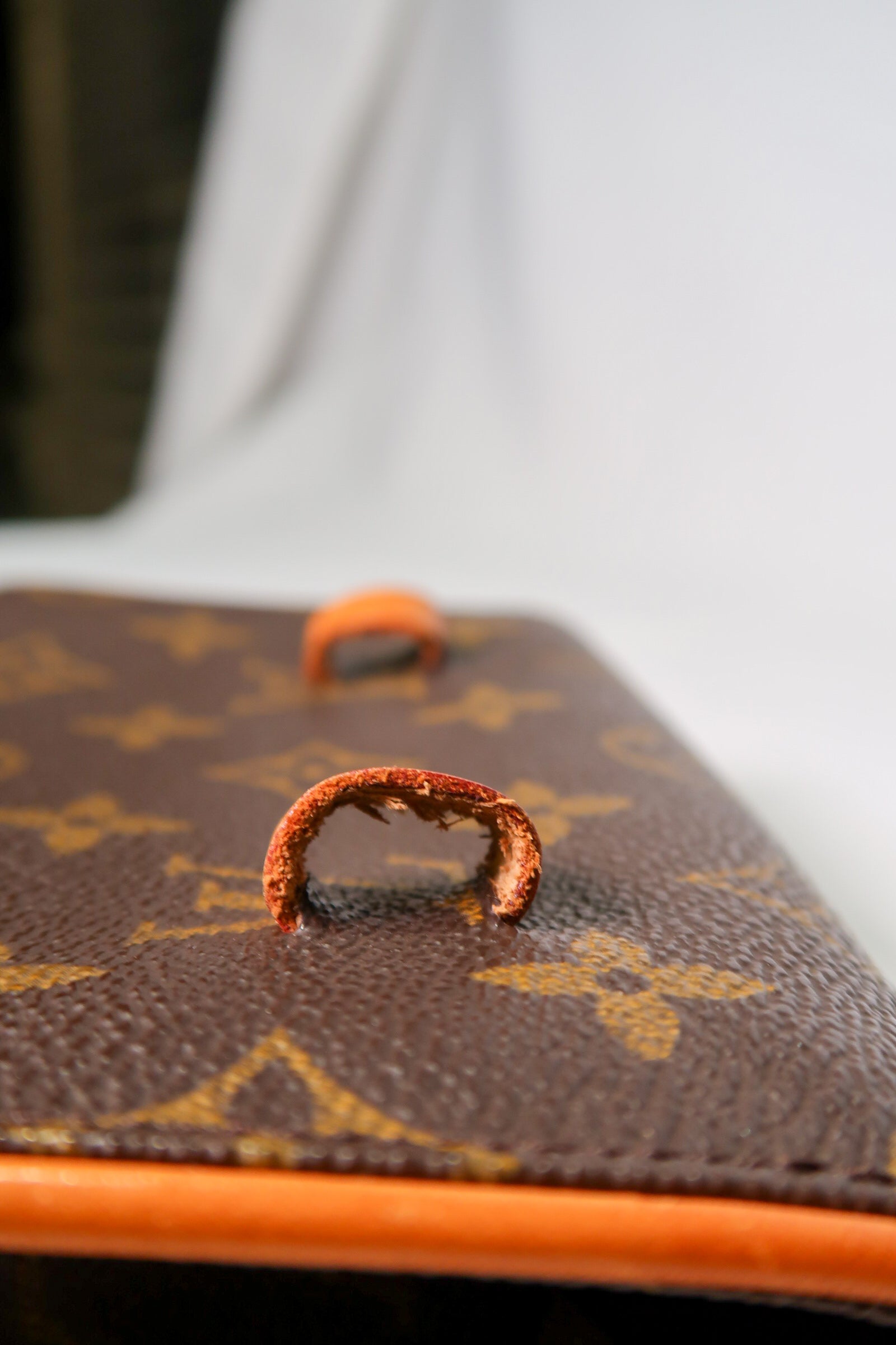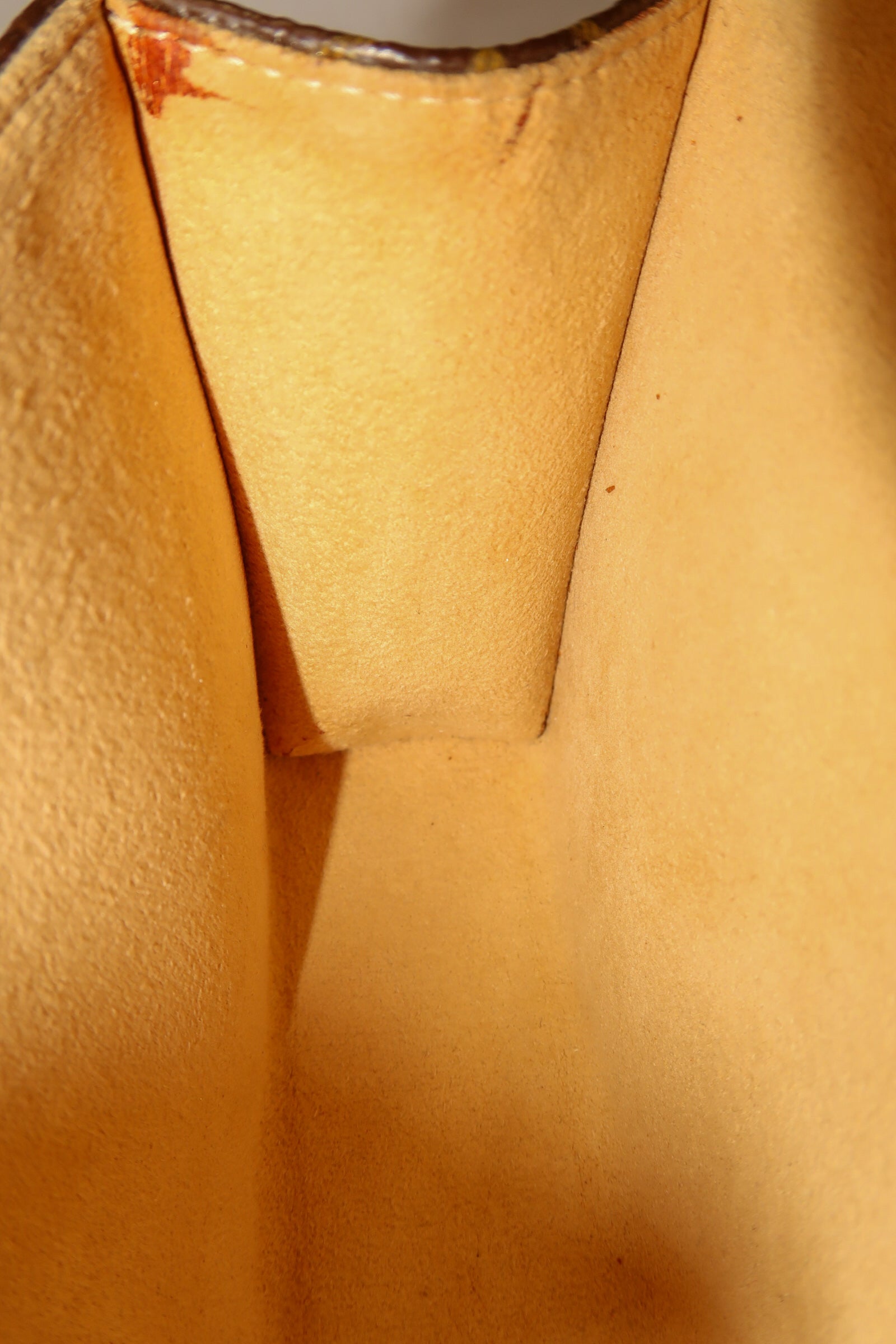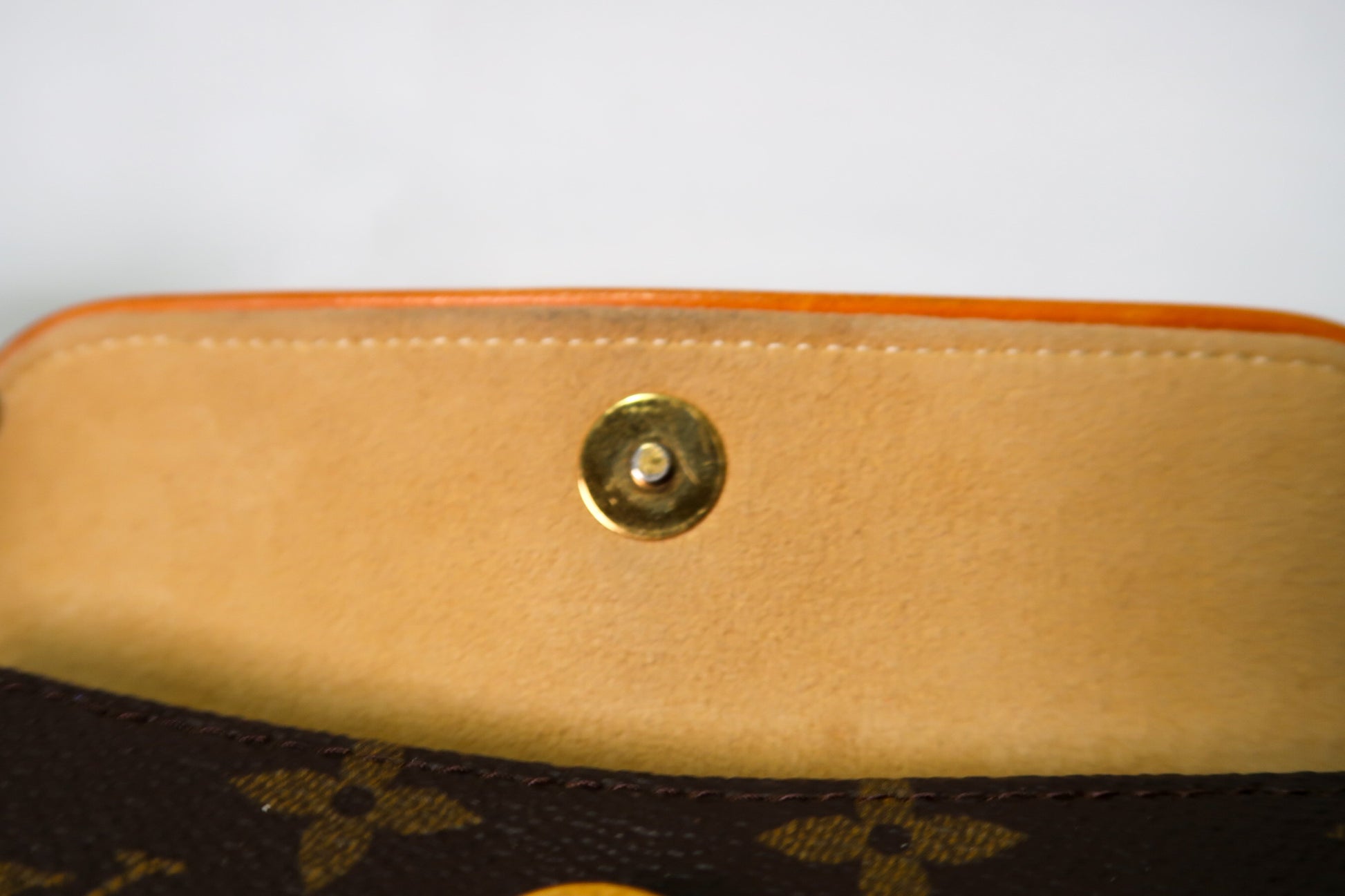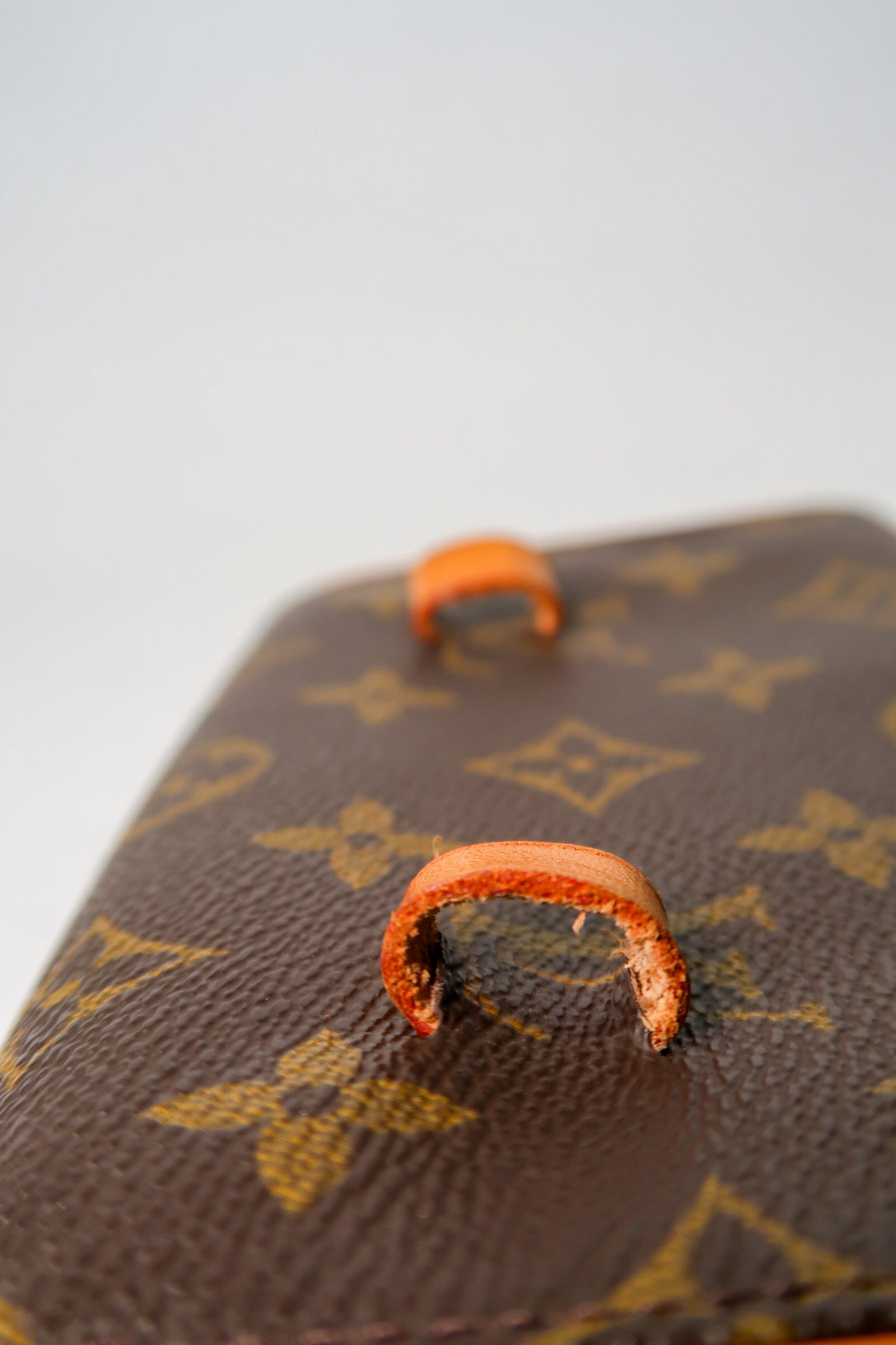 Exterior: Minor rubbing and surface wear on corners and edges of trim. Light wear on the vachetta leather piping and flap edges. Monogram canvas remains vibrant and intact. Strap: Light surface wear and minor creasing throughout leather; hardware snaps on strap show some light scratching but still function perfectly. Interior: Clean suede lining with minor darkening near the pocket opening; 2 stains in interior corner Hardware: Light surface scratches on magnetic closure and rivets; all pieces are intact and functional.