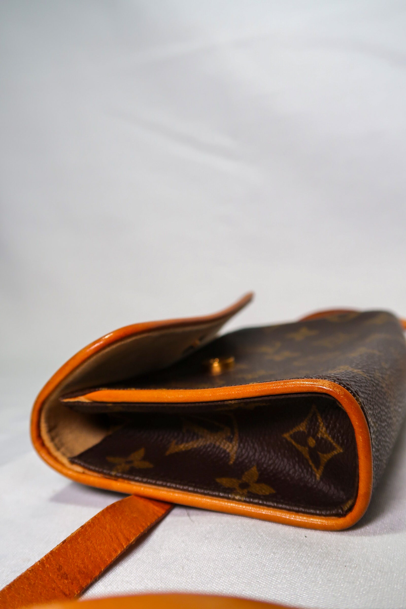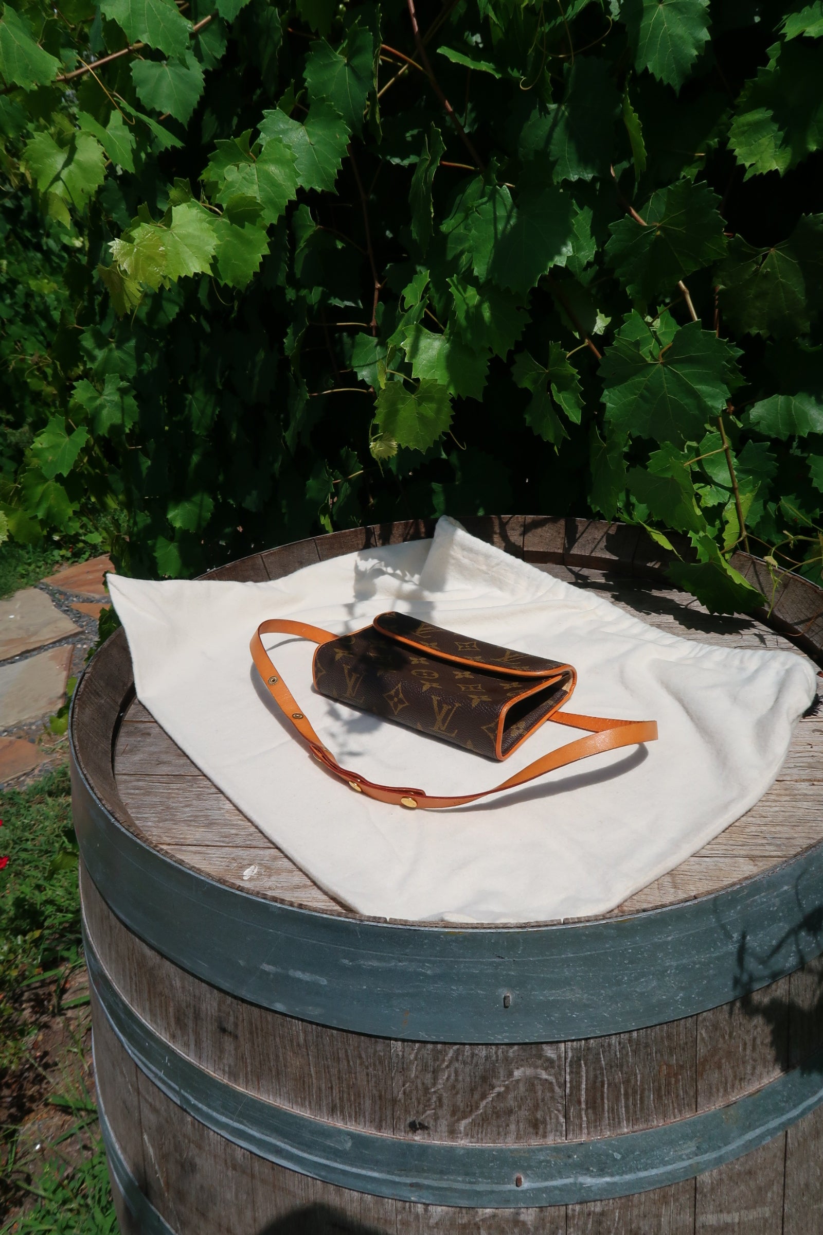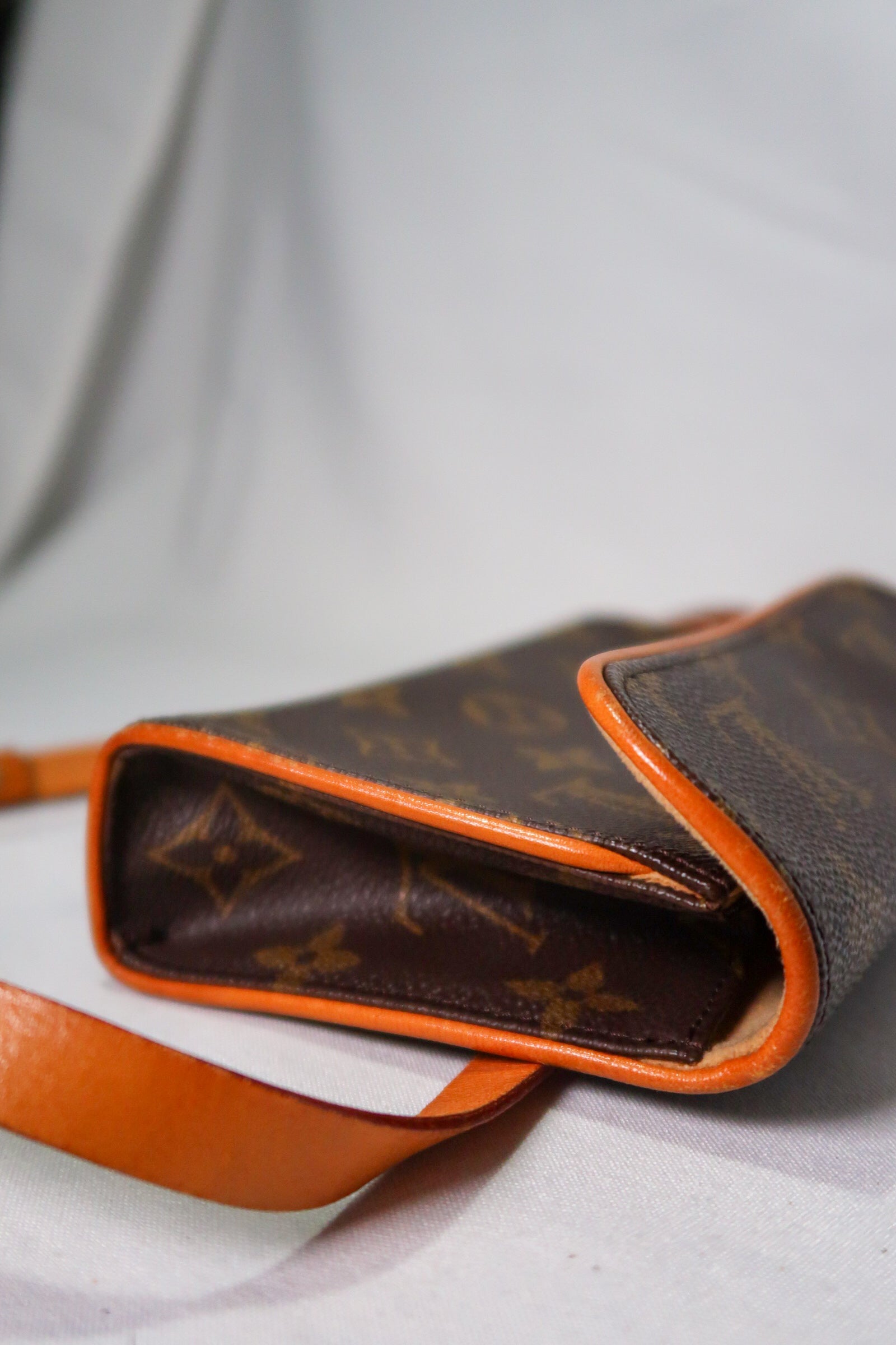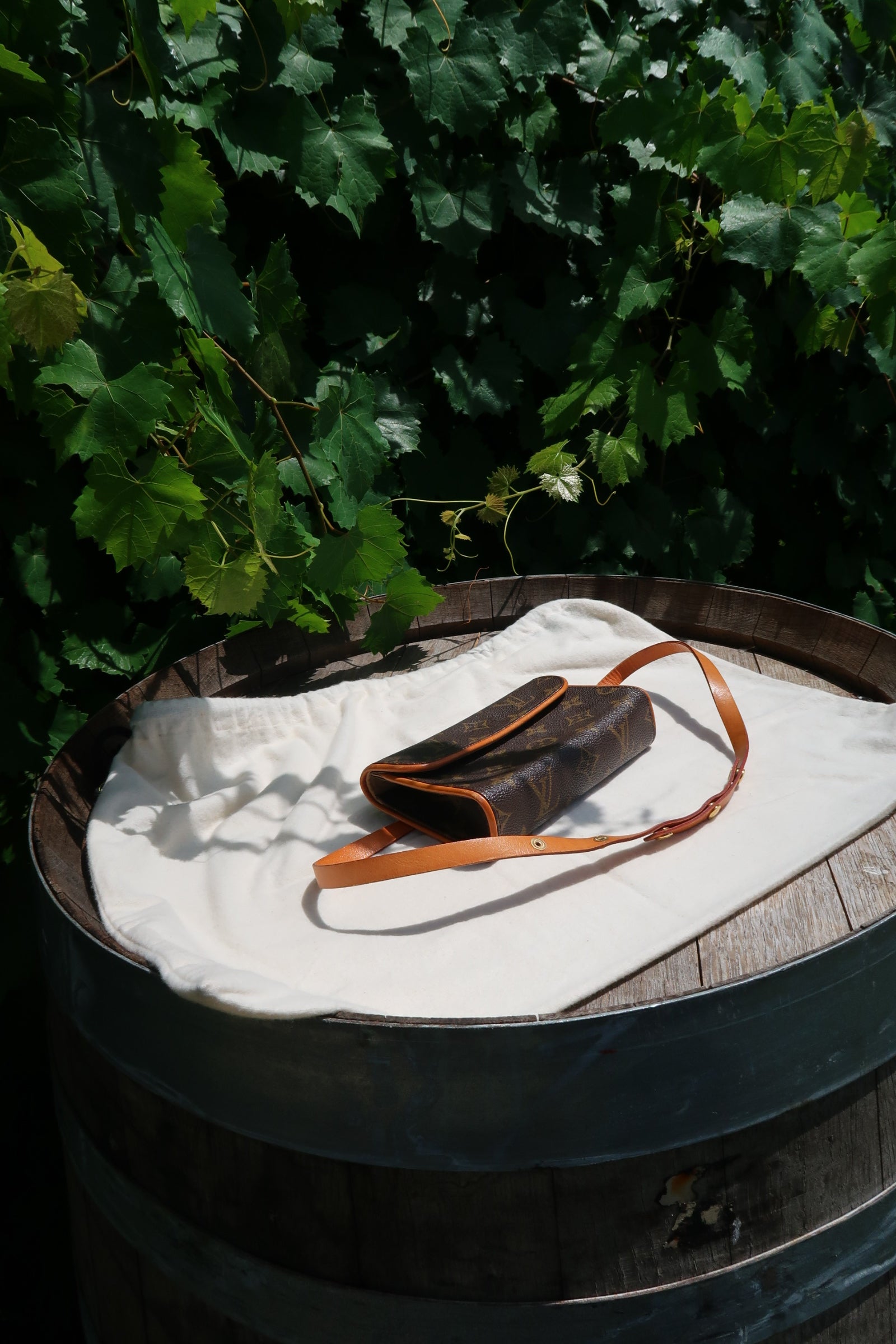 This is a pre-owned Louis Vuitton Twin Pochette XS in Monogram Canvas. Made in France, this piece features a slim silhouette and natural cowhide leather strap, perfect for hands-free wear or tucking under the arm. Lined with microfiber suede and secured by a magnetic flap, it’s ideal for light carry while maintaining classic LV elegance.